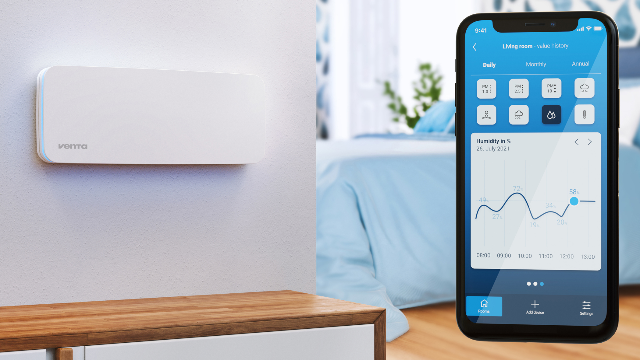 Die erfassten Daten geben ein sehr genaues Bild der Luftqualität im Raum, was auf zwei verschiedenen Arten signalisiert wird: Zum einen wird über die Farbe des LED-Lichtbands am Gerät angezeigt, wenn ein kritischer Wert erfasst wird, zum anderen sind die Daten über die Venta Home App auf dem Smartphone abrufbar.