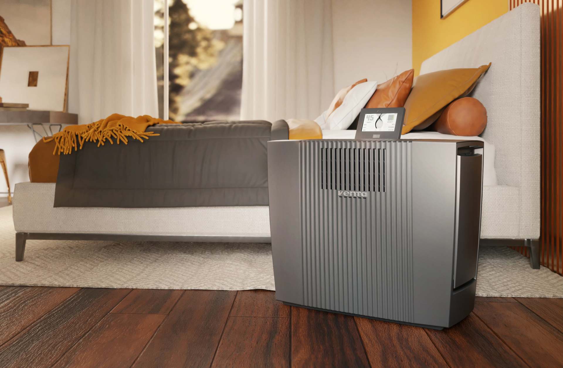 Die leistungsstarken Filter beseitigen Feinstaub (PM 1) sowie Partikel bis zu einer Größe von 0,07 Mikrometern. Das schließt auch Pollen, Hausstaub und krankheitserregende Viren mit ein. Darüber hinaus kontrolliert der PM 2,5 Sensor die Luftqualität und zeigt diese in 6 Farbabstufungen nach dem internationalen Air Quality Index auf dem Touch-Display an. Hier können alle Funktionen des Professional AP902 bedient werden, ebenso wie über die Venta App.