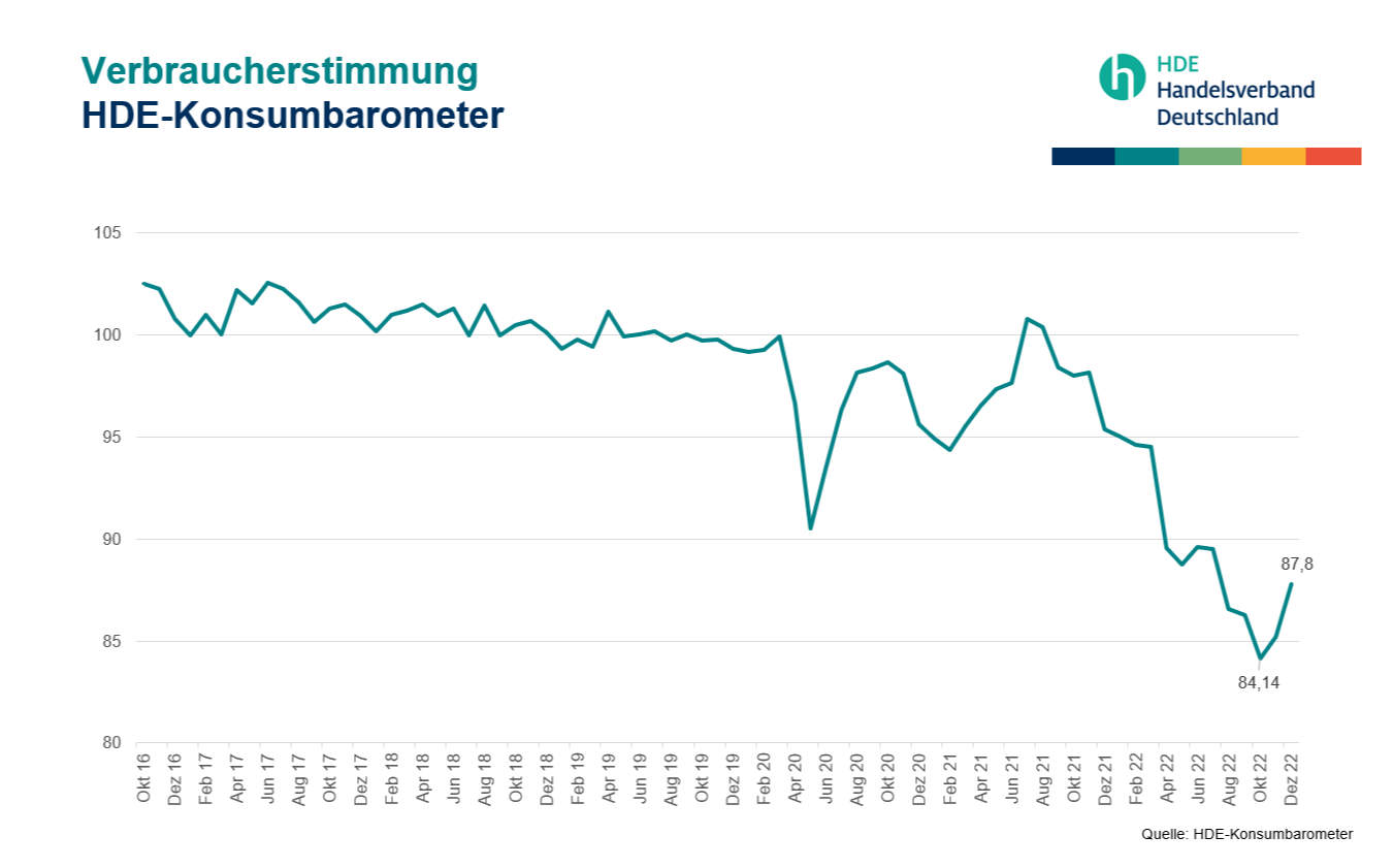 Das HDE-Konsumbarometer erscheint monatlich und basiert auf einer Umfrage unter 1.600 Personen zur Anschaffungsneigung, Sparneigung, finanziellen Situation und anderen konsumrelevanten Faktoren. Wichtig zu wissen: Es bildet nicht das aktuelle Verbraucherverhalten ab, sondern die erwartete Stimmung in den kommenden drei Monaten.