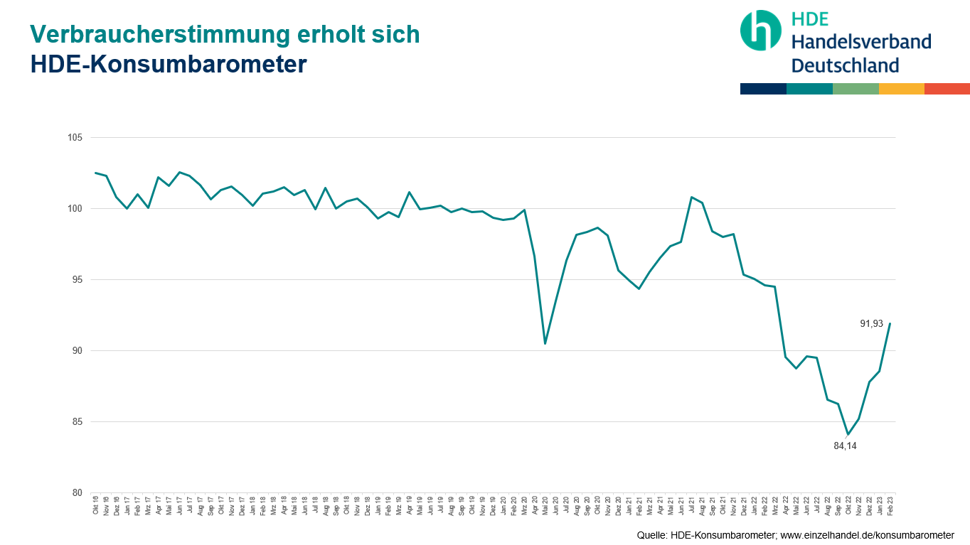 Für das Jahr 2023 erwartet der Handelsverband Deutschland (HDE) ein preisbereinigtes Umsatzminus von 3% im deutschen Einzelhandel. Das entspricht einem nominalen Plus von 2%. Das monatliche Konsumbarometer des Verbands zeigt in die gleiche Richtung: Der Index steigt den vierten Monat in Folge. Gleichzeitig steigt aber die Sparneigung. Insgesamt liegt die Stimmung unter dem Niveau vor dem Krieg in der Ukraine.