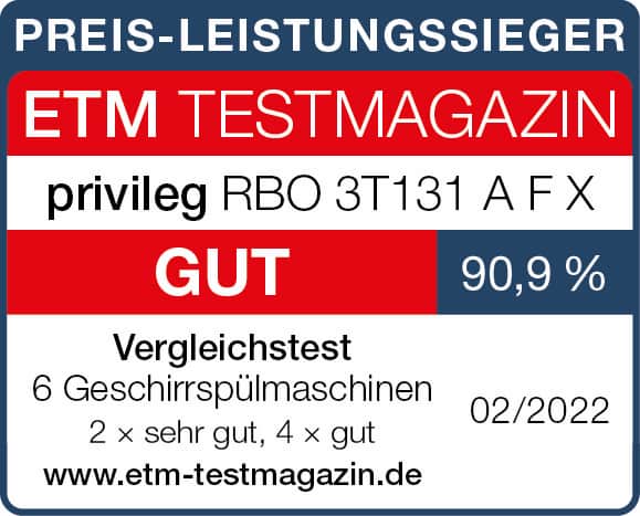 Mit einem außerordentlich voluminösen Innenraum sowie flexibel nutzbaren Körben überzeugt der Privileg Geschirrspüler. Der RBO 3T131 A F X besticht durch gute Reinigungs- und „exzellente Trocknungsleistung“. Als weiteren Pluspunkt nennen die Redakteure die Möglichkeiten, das Modell an die Ansprüche des Geschirrs anzupassen. Besonders heben sie in diesem Kontext die Tab-Option hervor. Daraus ergibt sich die Gesamtbewertung als Preis-Leistungssieger.