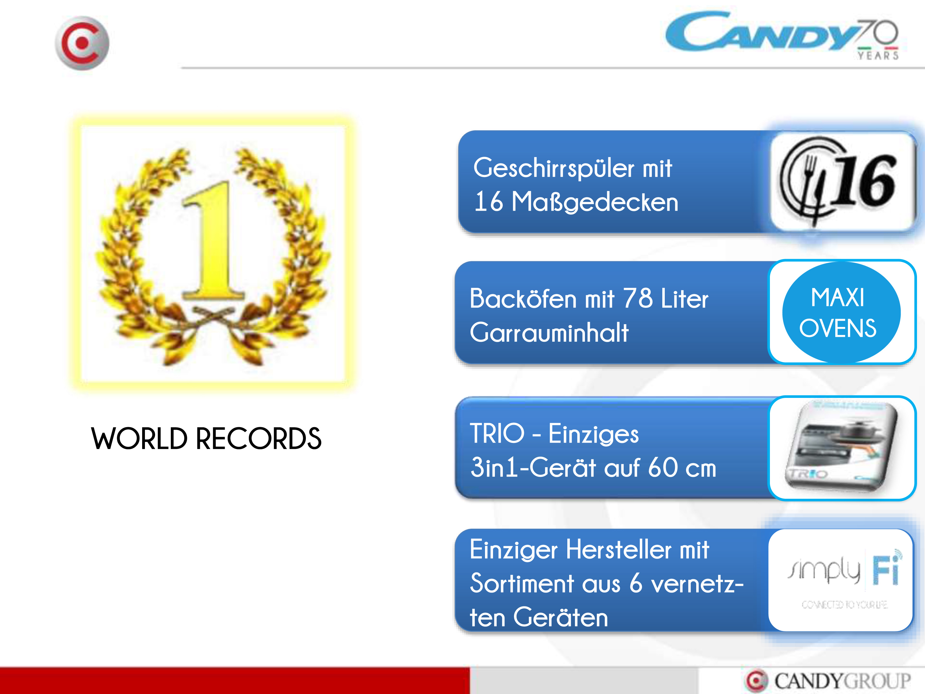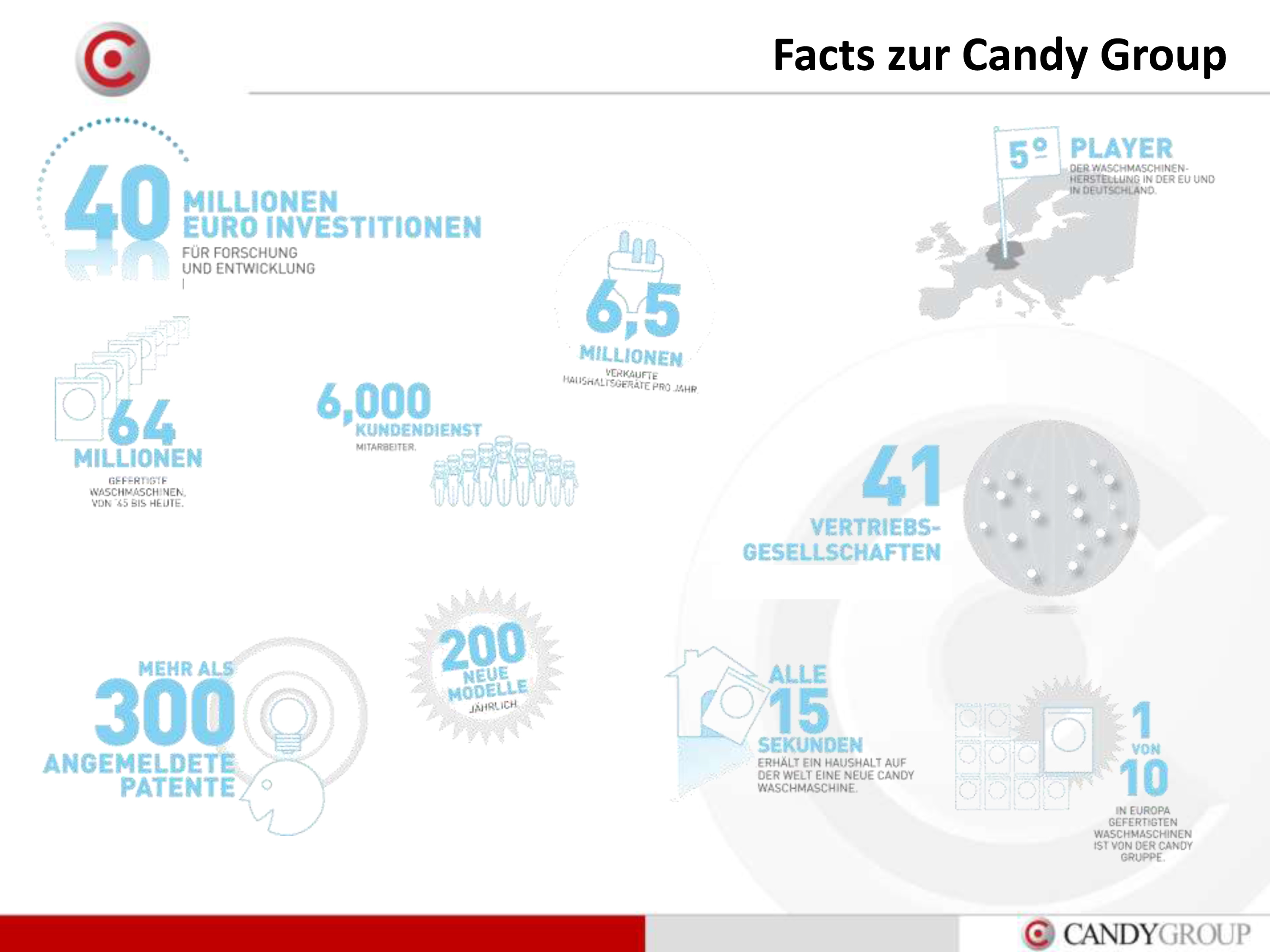 Alles begann im Jahre 1945 mit dem „Model 50“, der ersten italienischen Waschmaschine. Diese begründete die Candy Erfolgsgeschichte durch die Familie Fumagalli, die sich aktuell wie folgt liest: Rund 4.500 Mitarbeiter erwirtschafteten in 2014 einen Umsatz von 955 Millionen Euro. Und das Fumagalli-Unternehmen ist auf über 100 Märkten der Welt präsent.