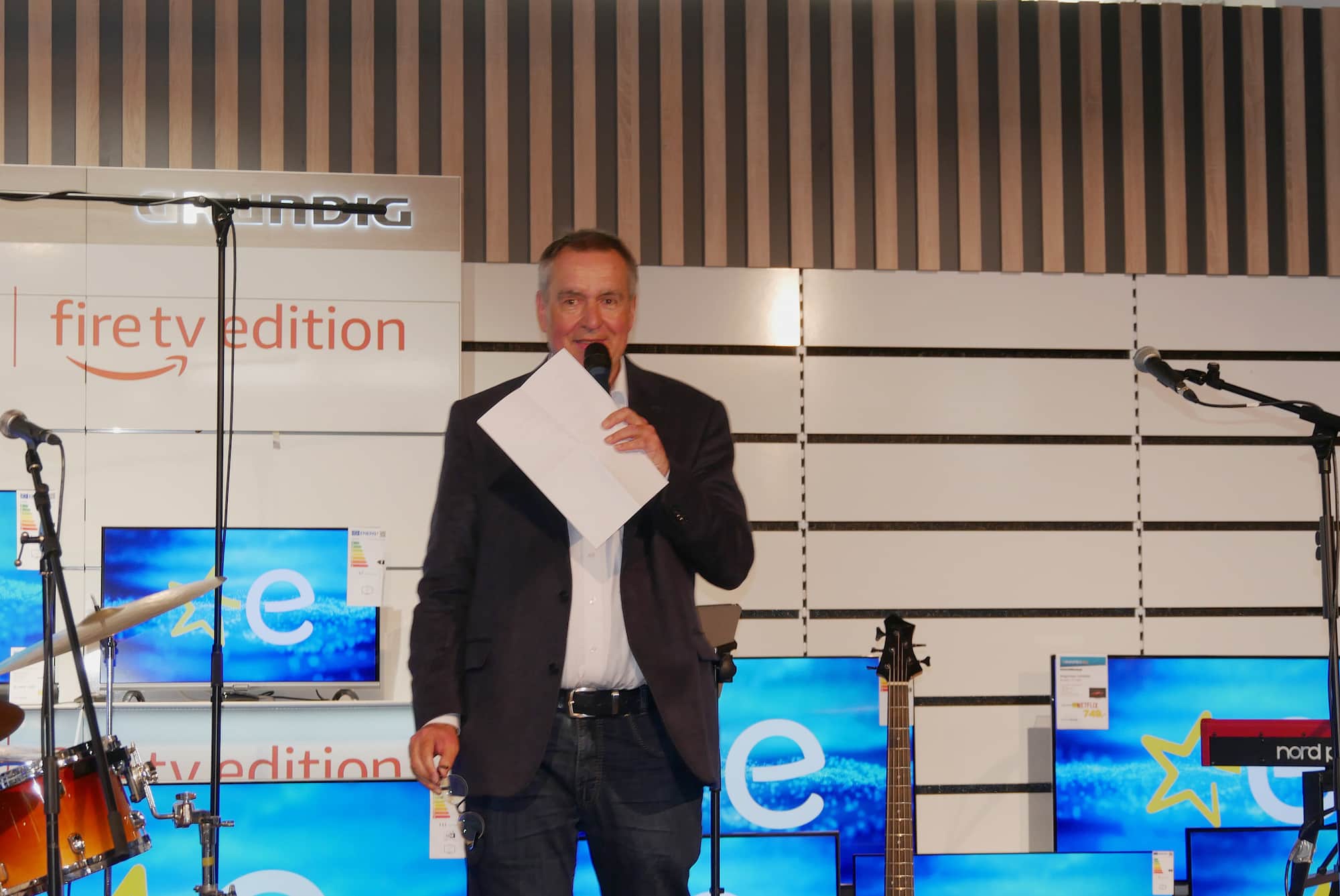 Dirk Wittmer (Euronics XXL Johann + Wittmer, Ratingen) in seiner Begrüßungsrede vor knapp 200 Gästen aus Industrie, Handel und Politik anlässlich des Refits seines Fachgeschäftes am 12. Mai in Ratingen.