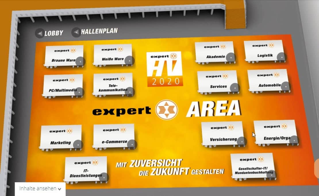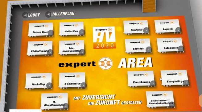 Chapeau expert! Die virtuelle Messe war technisch ziemlich weit vorne, ja, dürfte sogar so etwas wie eine Benchmark für die Branche gewesen sein. Mit einer Lobby, einem Hallenplan mit exakt 138 Ausstellern, 70 Workshop-Themen mit insgesamt über 200 Terminen und einer Networking Area haben die „experten“ versucht, das Look & Feel eines Messebesuchs nachzuahmen.