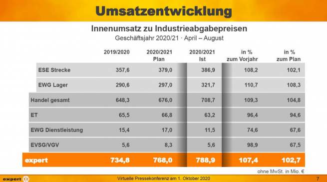 „Die Stimmung bei den experten ist gut“, bilanzierte Dr. Müller die mehrheitlich gut bewältigten Herausforderungen der Corona-Krise. Und weiter: „Die expert-Strategie geht auf – das Umsatzplus von 9,2 Prozent von April bis Juli gegenüber dem Vorjahr ist ein Beleg dafür. Wir gestalten die Zukunft mit Zuversicht: eine klare Strategie, zielgerichtete Kommunikation unter der permanenten Optimierung und Fokussierung – das sind auch künftig die Stärken von expert.“