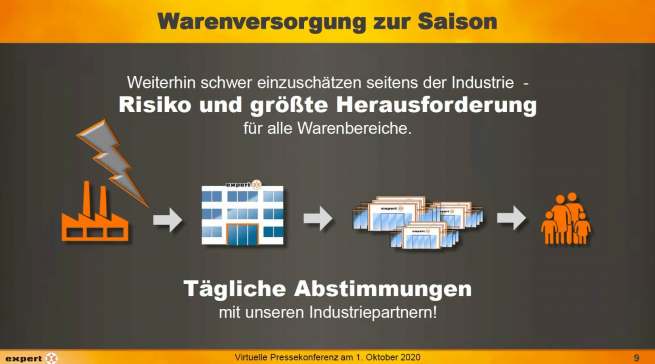 Frank Harder, Vorstand für Vertrieb, Marketing und E-Commerce, ging auf die aktuelle Markt- und Warensituation ein: „Wir freuen uns sehr über die Sonderkonjunktur. expert profitiert vom Zuhause-Trend und konnte sich im Zeitraum April bis Juli besser als der Markt (Anm. d. Redaktion: Markt +7,4%) entwickeln. Dieses hervorragende Ergebnis möchten wir auch künftig halten.“
