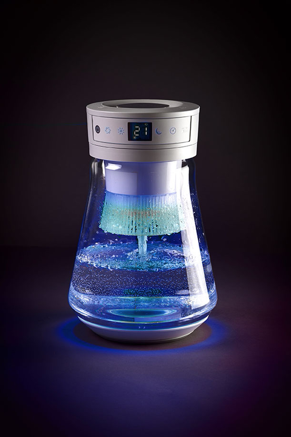 Einfach den Glasbehälter mit ausreichend frischem Wasser füllen, Bedieneinheit aufsetzen und schon reinigt der Lufterfrischer den Raum. Zur Auswahl stehen zwölf verschiedene stimmungsvolle LED-Farben.