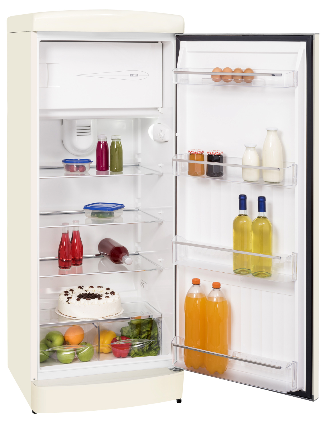 Zwei Gemüsefächer dienen der Lagerung von Obst und Gemüse. Im Flaschenfach sorgen „Kunststofffinger“ für sicheren Stand. Sie verhindern ein Verrutschen und Kippen der Flaschen. Geeignet ist das Fach für bis zu 1,5L PET-Flaschen. Rundum geschlossene Innentürablagen mit chrom-farbigen Applikationen ermöglichen auch bei verschütteten Flüssigkeiten für eine einfache und leichte Reinigung. Das Umluftkühlsystem gewährleistet eine gleichmäßige Temperatur- und Feuchtigkeitsverteilung im gesamten Kühlraum.