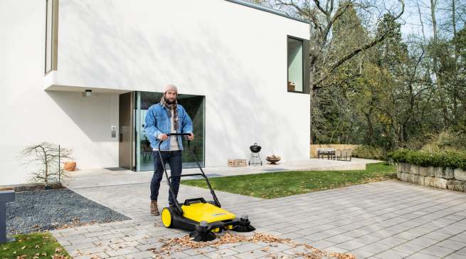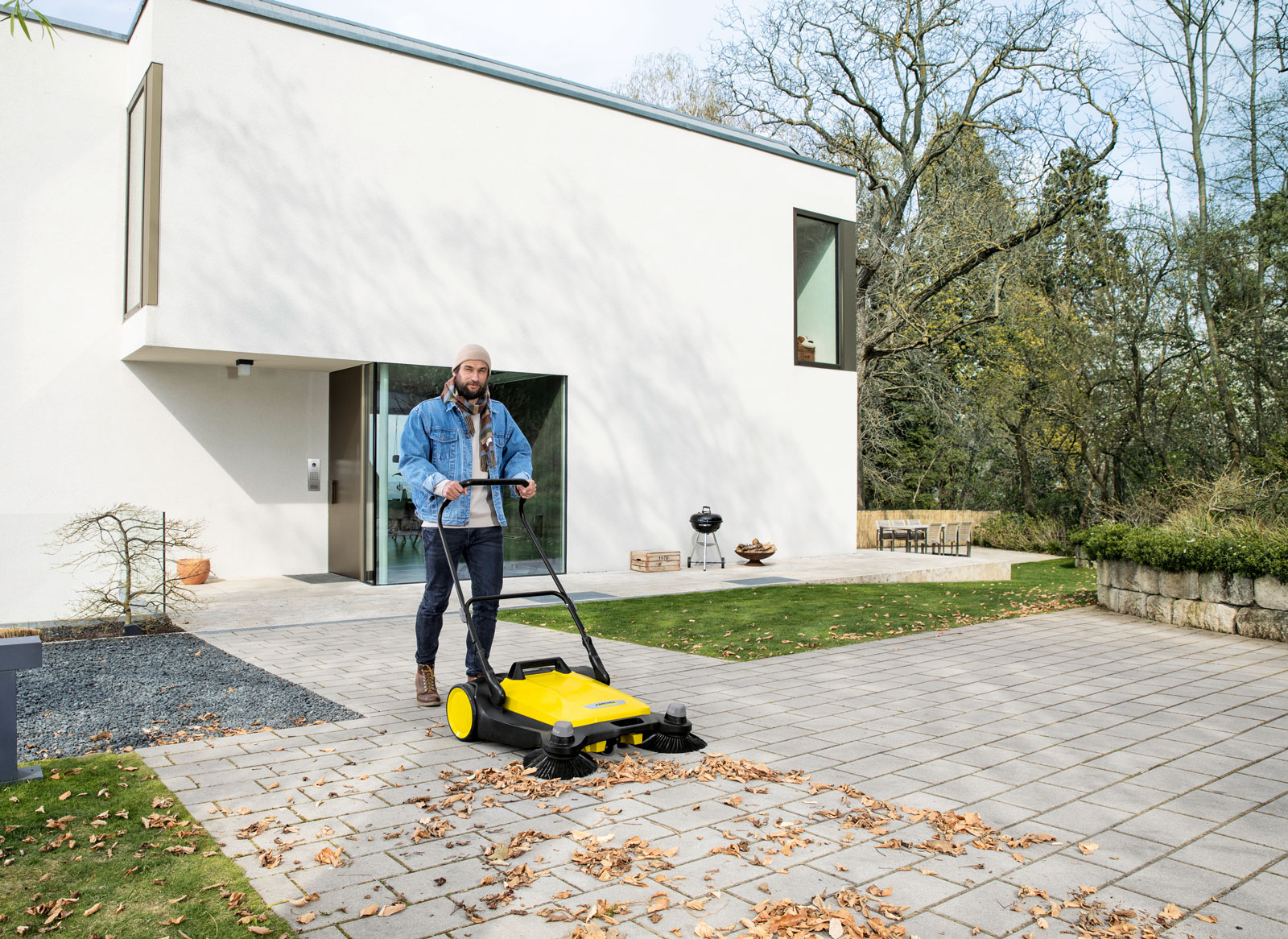 Sind Gartenwerkzeuge und Möbel gereinigt, geht es an die großen Flächen. Auf Gehwegen, Stellplätzen und Höfen kommt vor der Arbeit mit dem Hochdruckreiniger zunächst die Kehrmaschine zum Einsatz, um losen Schmutz aufzunehmen. Das geht bis zu fünfmal schneller als mit Besen und Kehrschaufel und schont den Rücken.