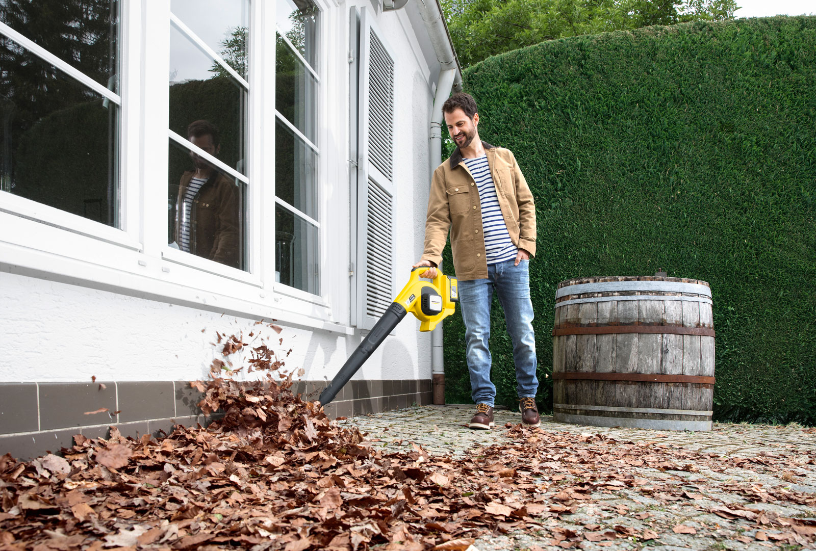 Wo der Platz fehlt, um die Kehrmaschine zu bewegen oder auf Oberflächen, auf denen sie sich nicht sinnvoll einsetzen lässt, erweist sich ein Laubbläser als praktischer Helfer. Mit dem kräftigen Luftstrom werden Laub und loser Schmutz auf Stufen im Eingangsbereich, auf Wegplatten im Rasen oder auf Kiesstreifen schnell und mühelos wegblasen.