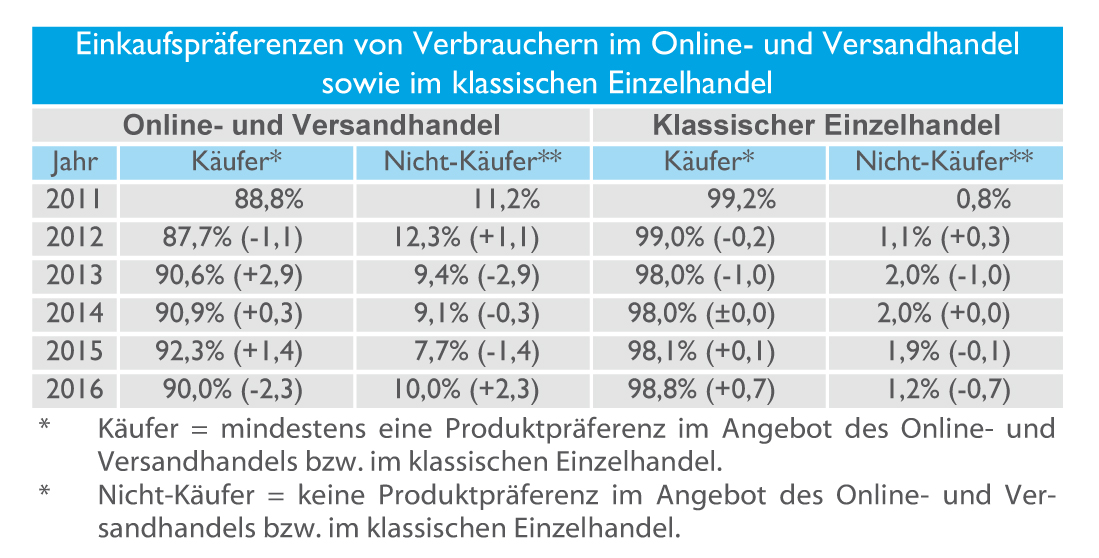 Die Nutzung des Online- und Versandhandels in Deutschland bleibt auch 2016 trotz leichter Einbußen auf höchstem Niveau. Damit korrespondierend entwickelte sich der Umsatz des Online- und Versandhandels 2014 und auch 2015 etwas verhaltener als in den Jahren zuvor. So konnte die aktuelle Analyse „Die Wirtschaftslage im deutschen Interaktiven Handel B2C 2015/2016“ belegen, dass der Umsatz im Interaktiven Handel (klassische Bestellwege und E-Commerce) von 2014 auf 2015 auf ähnlichem Niveau zulegte wie von 2013 auf 2014.Der Umsatz im Interaktiven Handel (klassische Bestellwege und E-Commerce) steigerte sich zuletzt von 50,2 auf 52,4 Milliarden Euro inkl. USt um 4,4 Prozent. Auch im Sommer 2016 werden nach Angaben der Verbraucher vier von zehn aller Einkäufe „lieber“ im Online- und Versandhandel getätigt – bei aktuell leicht zurückgehender Tendenz (40,2 Prozent; – 1,2 Punkte). Umgekehrt geben allerdings derzeit rund 60 Prozent der befragten Verbraucher an (59,2 Prozent; + 1,2 Punkte), bevorzugt im klassischen Einzelhandel einzukaufen.