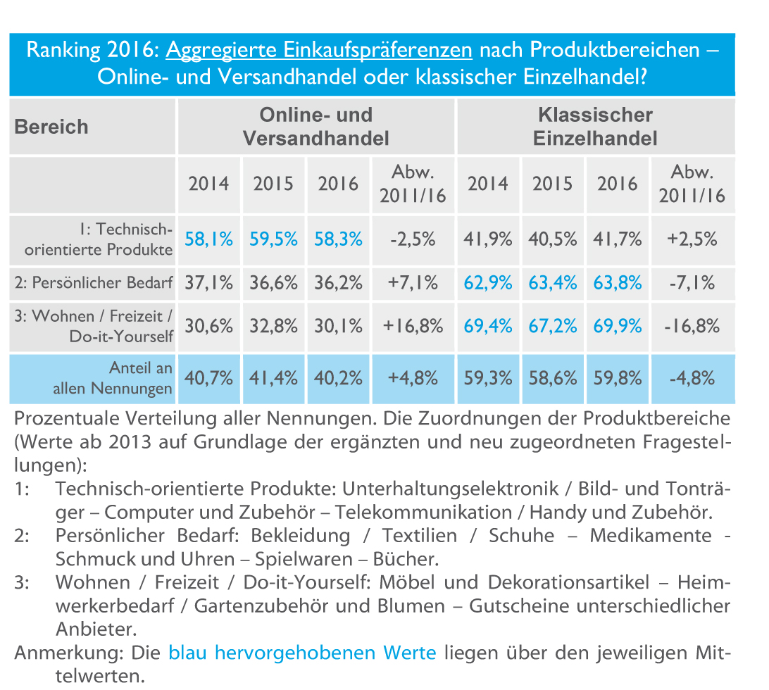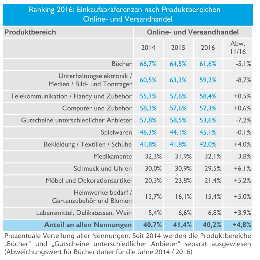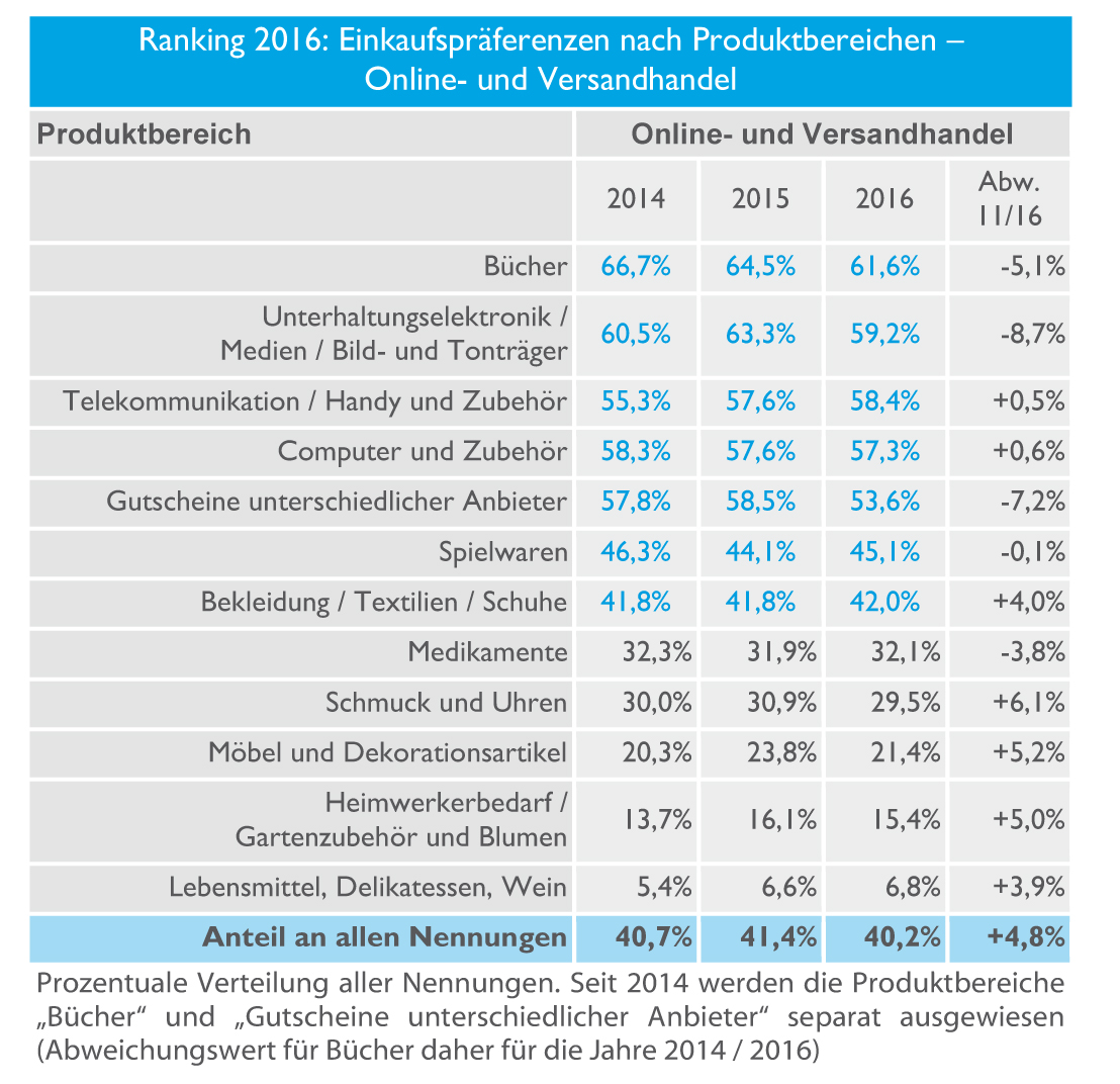 Zum dritten Mal in Folge belegt der Produktbereich Bücher den Spitzenplatz in der Käufergunst beim Einkauf im Online- und Versandhandel – mit allerdings wiederum zurückgehender Tendenz (2016: 64,5 Prozent; – 2,9 Punkte). Der Produktbereich „Unterhaltungselektronik / Bild- und Tonträger“ (59,2 Prozent; – 4,0 Punkte) rangiert auch in diesem Jahr auf Rang zwei, ebenfalls mit zurückgehenden Online-Präferenzwerten. Auf den Rängen drei und vier folgen die Produktbereiche „Telekommunikation / Handy und Zubehör“ vor „Computer und Zubehör“. Die Online-Präferenzwerte dieser letztgenannten drei besonders technik- und unterhaltungsaffinen Warengruppen verbleiben deutlich über den entsprechenden Vergleichswerten für den Einkauf im klassischen Einzelhandel.