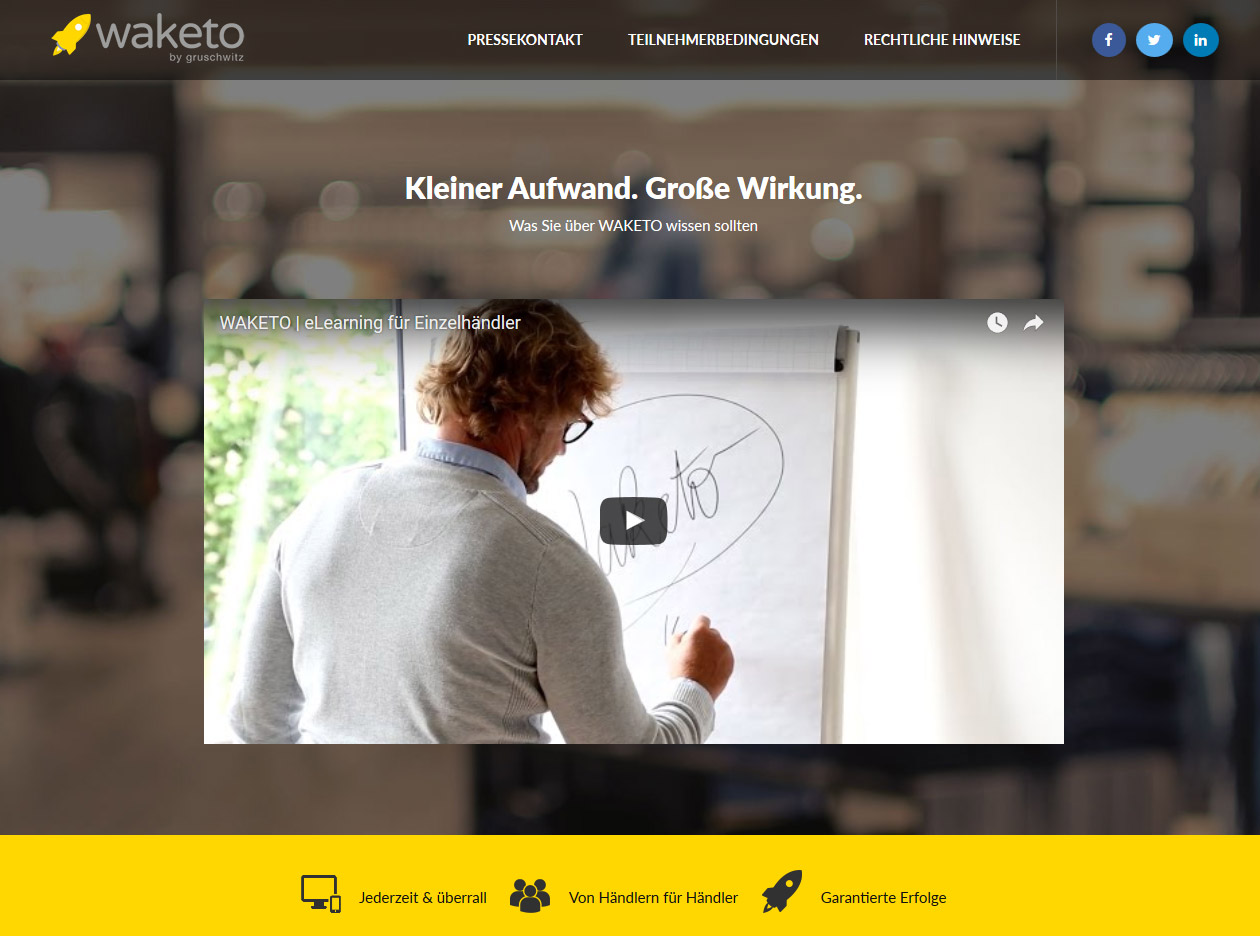 Waketo kommt: Die eLearning Plattform will direkt an die Bedürfnisse der Einzehändler anknüpfen. Die Video-Kurse sind erheblich günstiger als ihre Offline-Pendants und können vorab auf Herz und Nieren geprüft werden – darüber hinaus sind gekaufte Inhalte immer wieder abrufbar. Waketo ermöglicht zeitlich und örtlich flexibles Lernen durch videobasierte Kurse von Top-Einzelhandels-Experten in Deutschland. Das Lernangebot umfasst Video-Kurse zu den Themen Verkaufsförderung, Verkaufsraumgestaltung und Marketing – immer im Hinblick auf die Probleme der Einzelhändler.