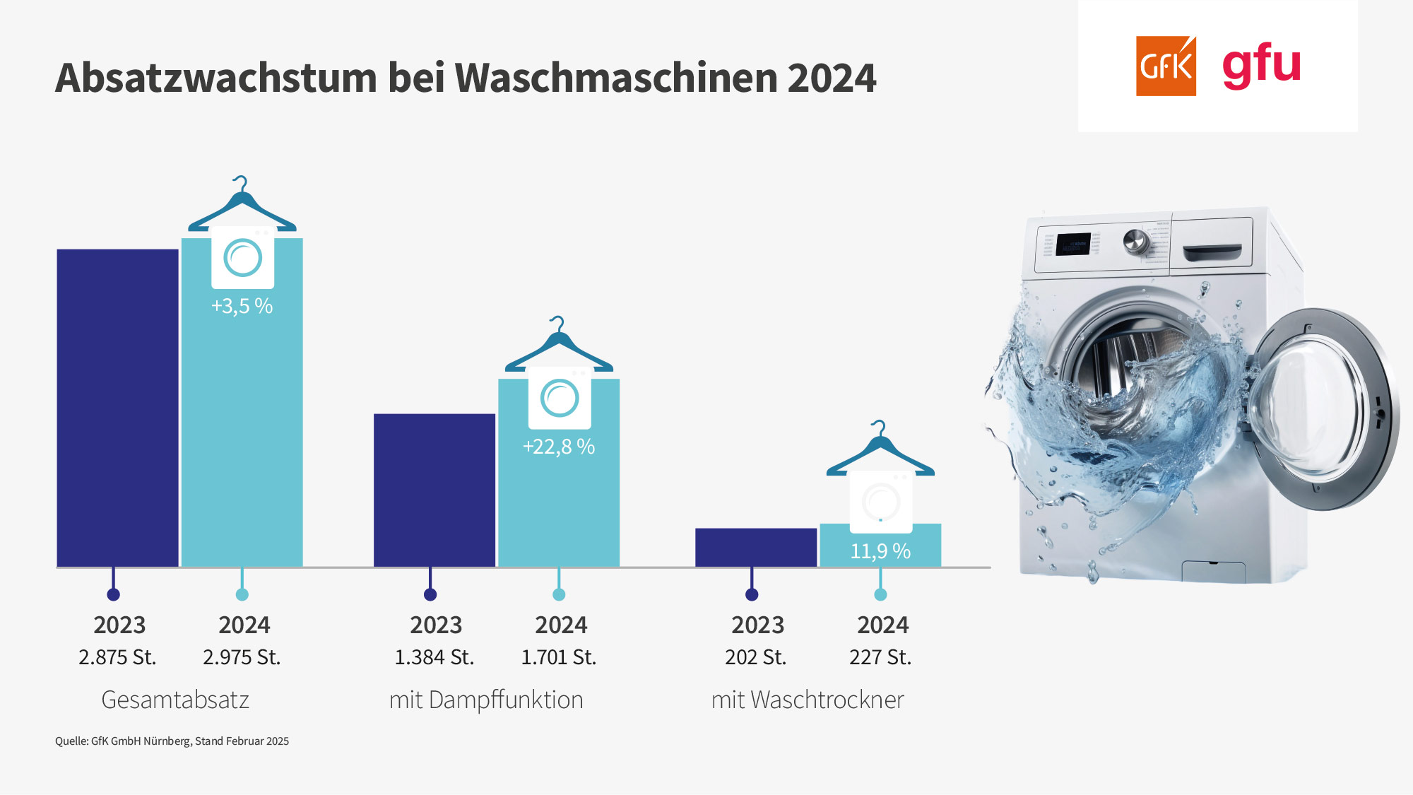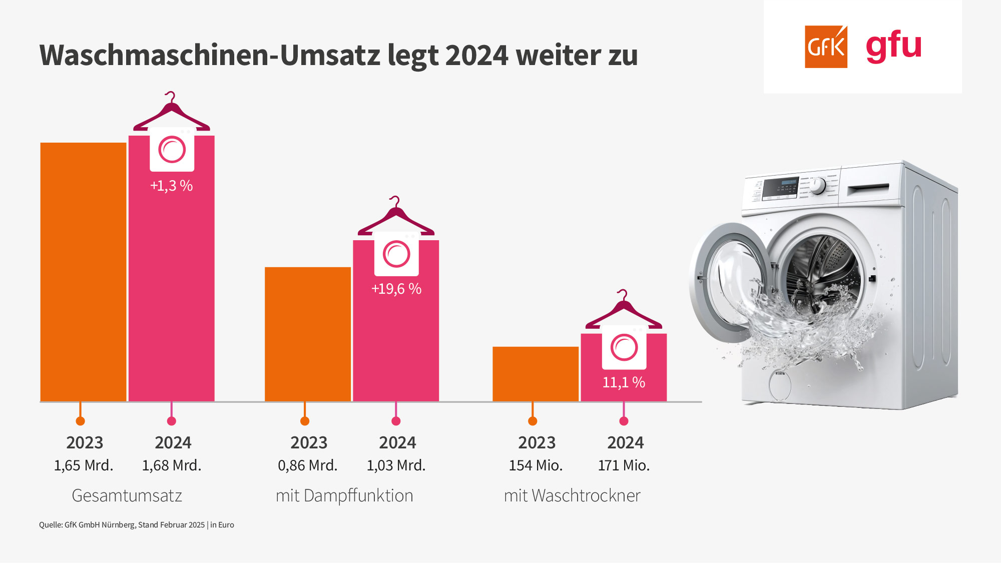 Dies spiegelt sich auch in Umsatz- und Absatzzahlen deutlich wider. Die Zahlen der GfK zeigen im Jahr 2024 ein solides Wachstum für den Waschmaschinenmarkt: Der Gesamtumsatz stieg um 1,3% auf rund 1,68 Mrd. Euro, während die Verkaufszahlen um 3,5% auf knapp 3 Millionen Geräte anstiegen. Besonders gefragt waren Modelle mit innovativen Funktionen wie Dampftechnologie oder Wasch-Trocken-Kombinationen.