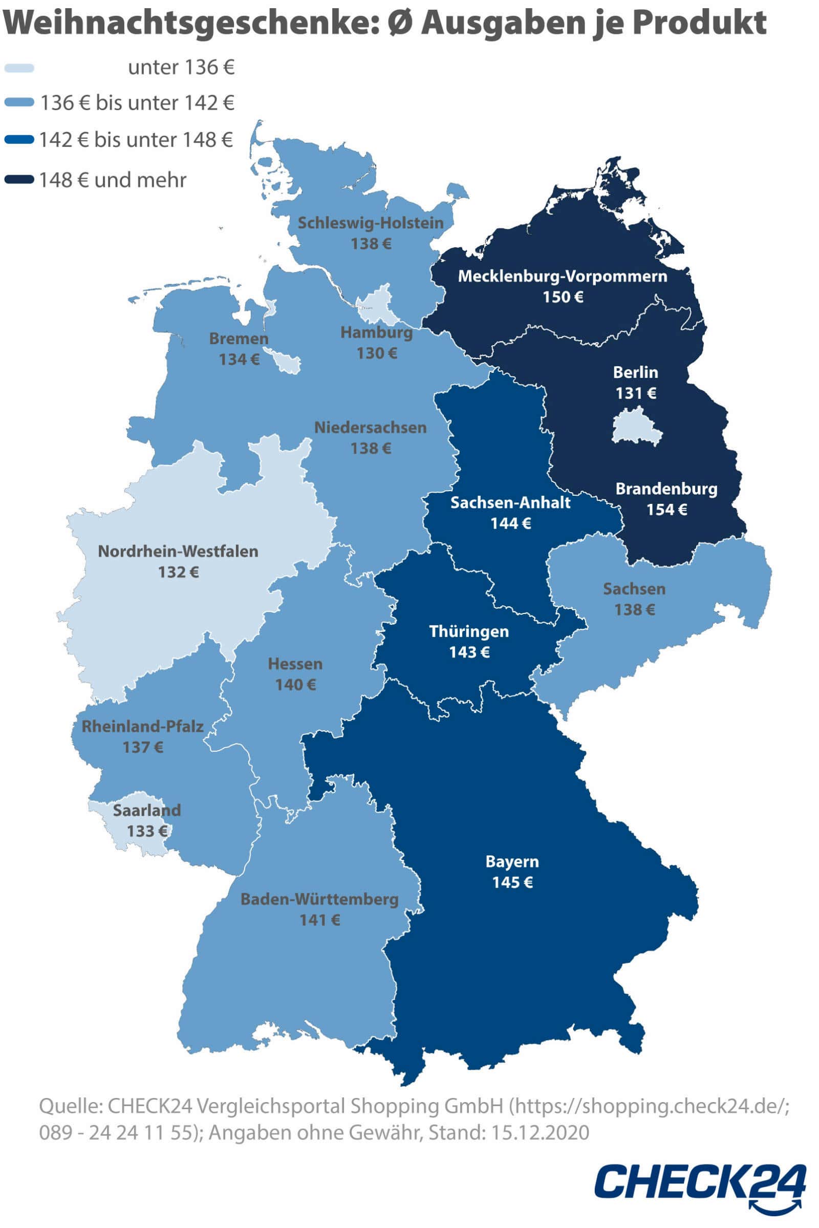 Check24 hat alle Bestellungen im Shoppingbereich des Vergleichsportals im vierten Quartal 2020 nach Artikelpreis und Wohnort der Kunden betrachtet. Dabei stellte sich heraus, dass Brandenburger die teuersten Geschenke kauften. In der Vorweihnachtszeit gaben sie Bestellungen im Wert von durchschnittlich 154 EUR je Produkt auf. Die günstigsten Produkte mit im Schnitt 130 EUR kauften die Hamburger.
