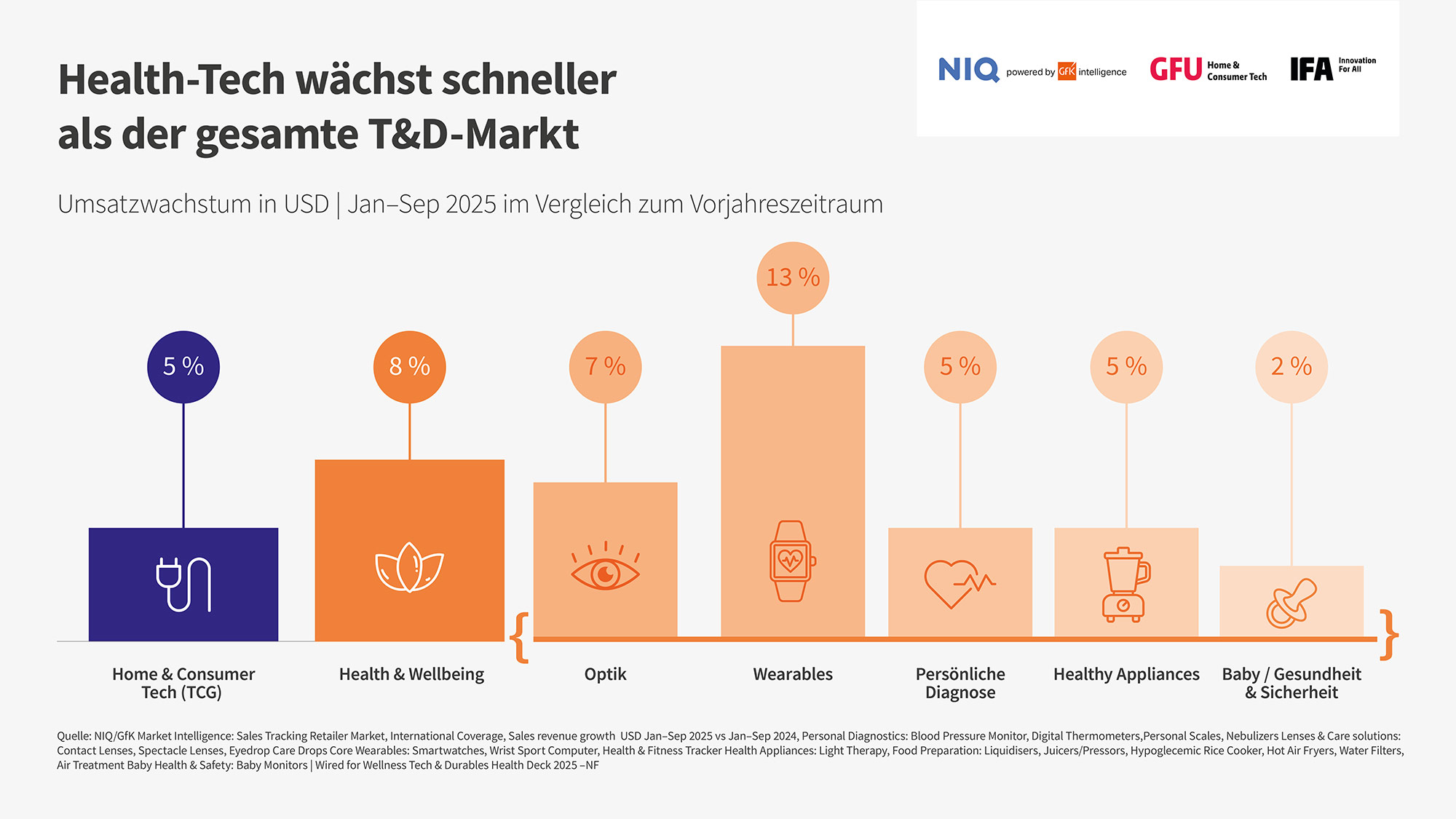 Health-Tech wächst mit 8 Prozent Umsatzplus im Zeitraum Januar bis September 2025 schneller als der Gesamtmarkt für technische Gebrauchsgüter (TCG). Besonders dynamisch entwickeln sich Wearables mit einem Plus von 13 Prozent.