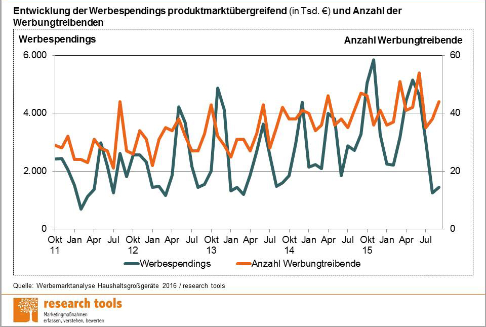 Die „Werbemarktanalyse Haushaltsgroßgeräte 2016“ von research tools untersucht die Werbeausgaben der Marken von Haushaltsgroßgeräte in Deutschland. Sie gibt auf 129 Seiten Einblick in Trends, Benchmarks und Strategien in den zehn Teilmärkten Dunstabzugshauben, Einzelhandel, Geschirrspüler, Klimaregulierung, Koch- und Backgeräte, Kooperationen, Kühl- und Gefrierschränke, Range, Trockner, Waschmaschinen.