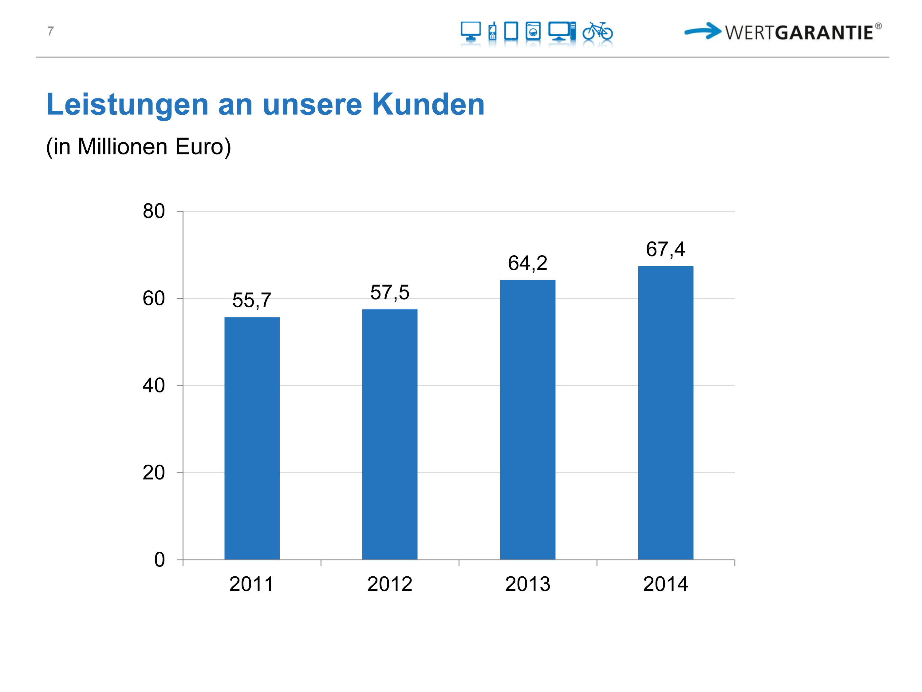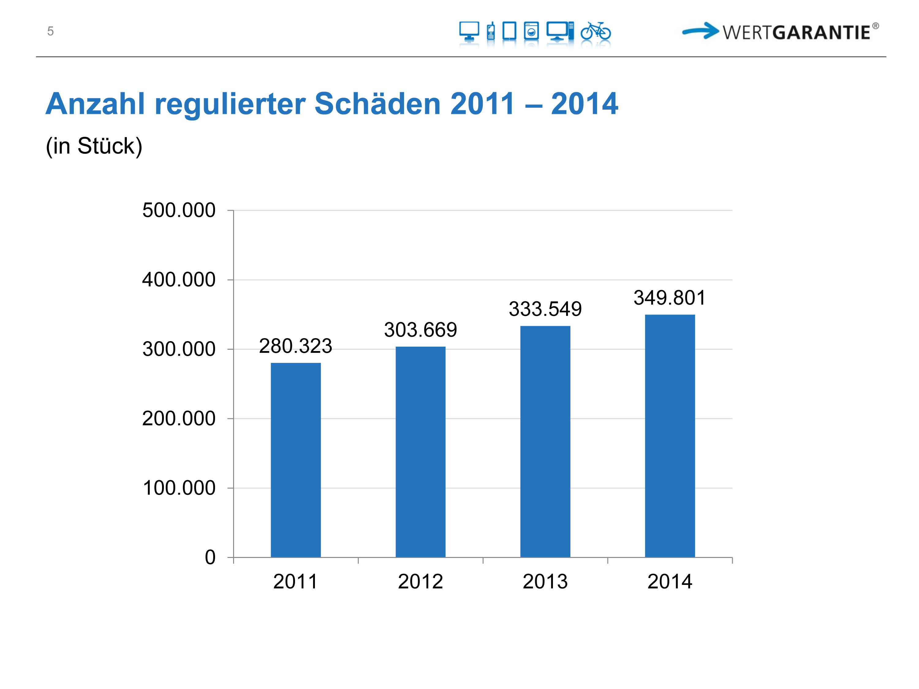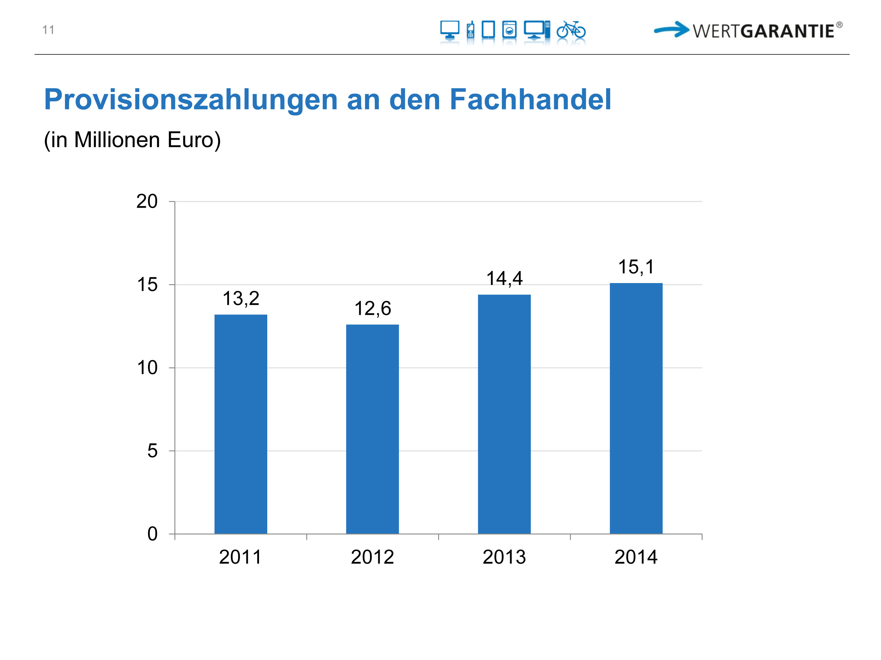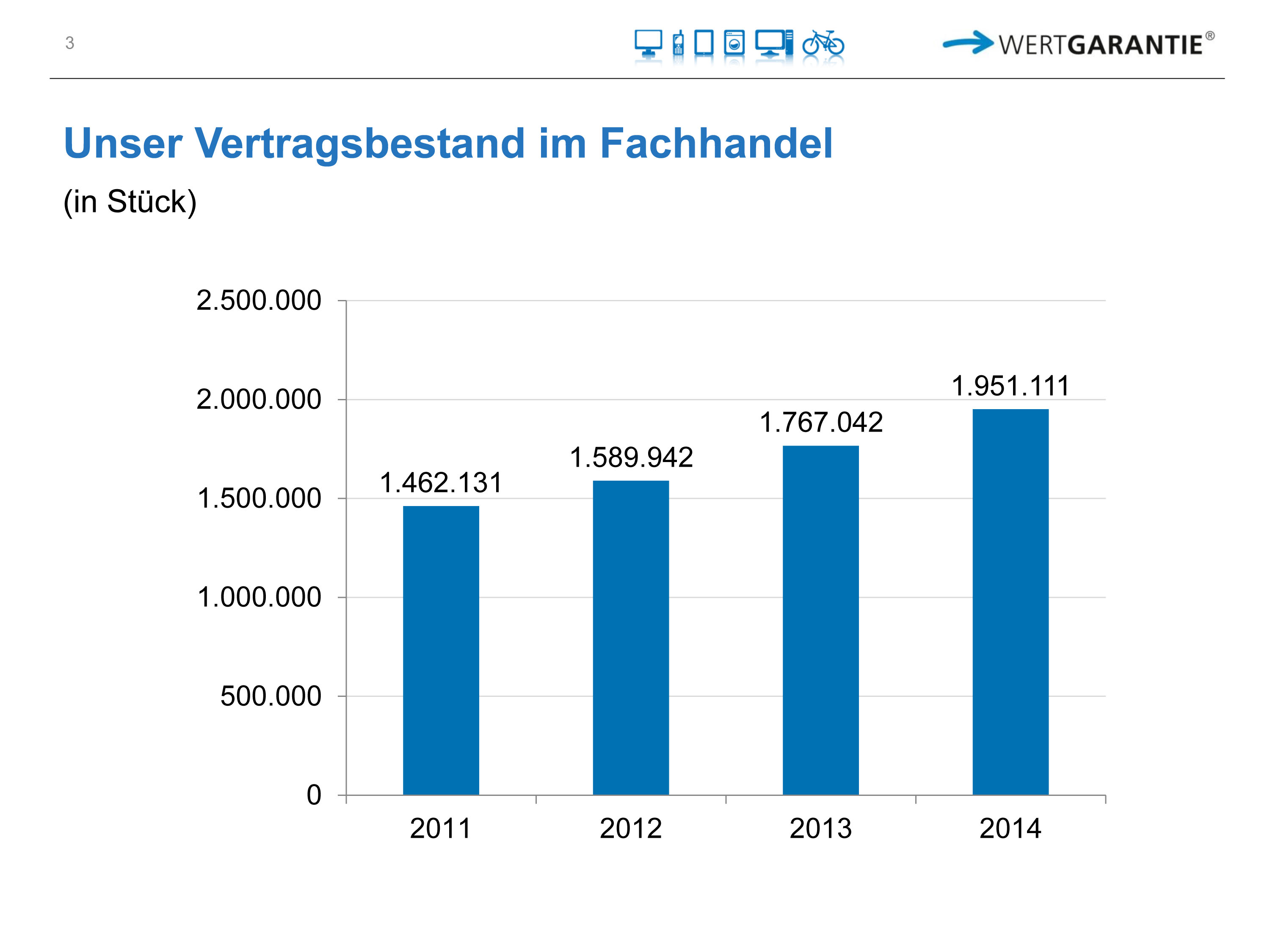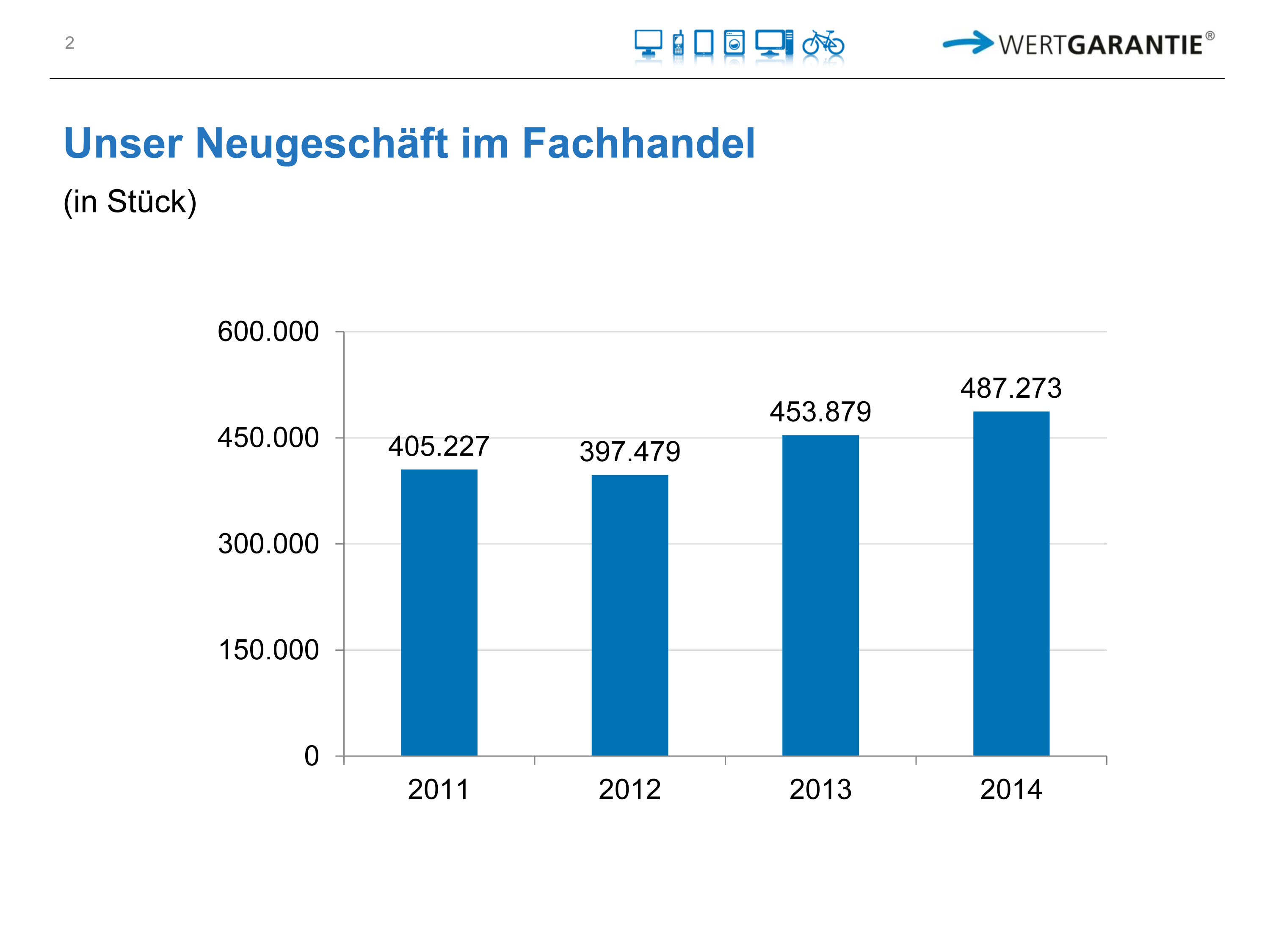 Mit über 1,95 Millionen Verträgen, plus 10Prozent zum Vorjahr, hat der Vertragsbestand bei der Wertgarantie ein neues Allzeithoch erreicht. Im Jahr 2014 wurden über 350.000 Schadensfälle reguliert und an den Handel flossen rund 15 Millionen Euro an Provisionen. (mehr Details unter Wertgarantie kompakt).