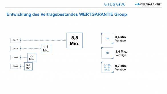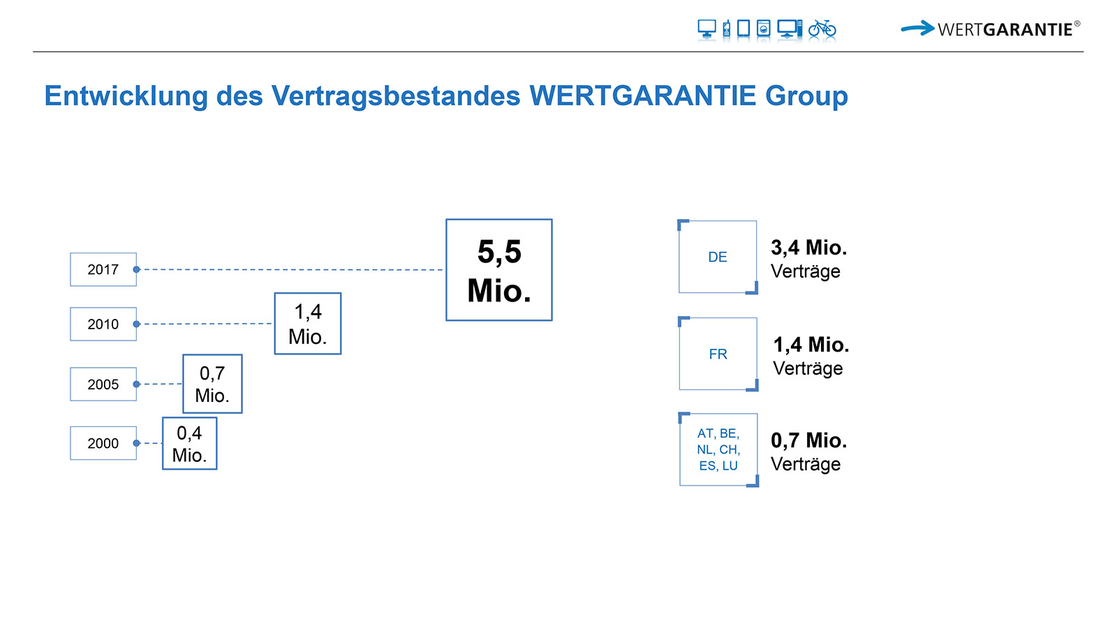 International sieht sich Wertgarantie gut aufgestellt. Zu den 3,1 Millionen Bestandsverträgen aus Deutschland kommen 1,4 Millionen Verträge aus Frankreich sowie 0,7 Millionen Verträge aus Österreich, der Schweiz, Spanien und den Benelux-Staaten hinzu. Aus dem Schweizer Geschäft hat sich das Unternehmen Ende 2017 zurückgezogen. Und das aus gutem Grund: Das Wertgarantie-Modell passe nicht auf den Schweizer Markt, da die Schweizer Kunden generell eine Abneigung gegen das Lastschriftverfahren hätten.