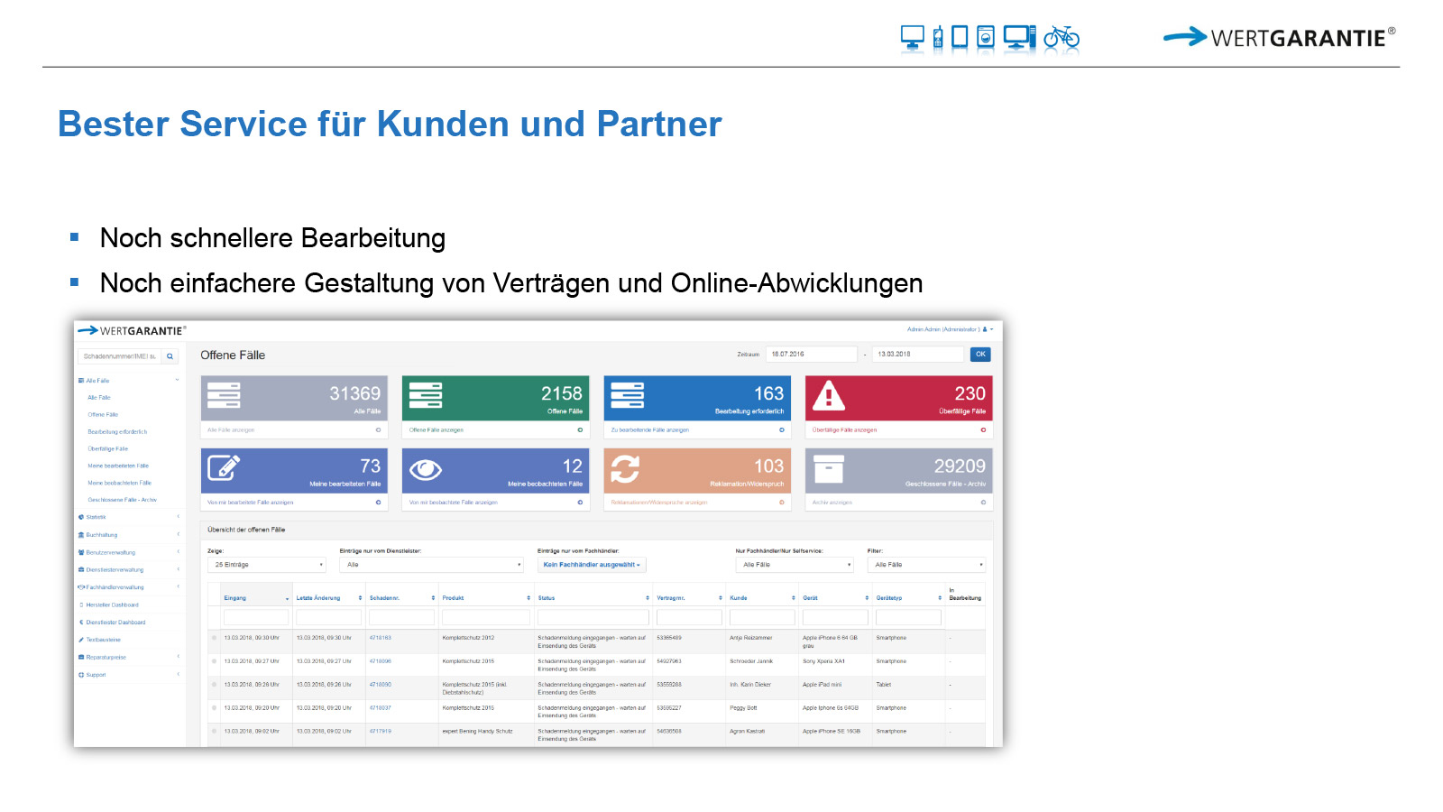 So stellt Wertgarantie aktuell zum Beispiel für Kunden, Fachhandelspartner wie auch für angeschlossene Reparaturdienstleister ein einheitliches Online-Schadenabwicklungssystem bereit. Schäden werden über dieses System nicht nur schnell und einfach abgewickelt, sondern es bietet allen Beteiligten Transparenz und einen Kundenservice mit Echtzeitinformation für ein hohes Maß an Kundenzufriedenheit. „Die Kunden können jeden einzelnen Schritt der Abwicklung nachvollziehen, da sie stets informiert sind – und die Fachhandelspartner haben zudem nach der Erfassung der Schäden deutlich weniger Kommunikationsaufwand“, verdeutlicht Schröder die Vorteile.