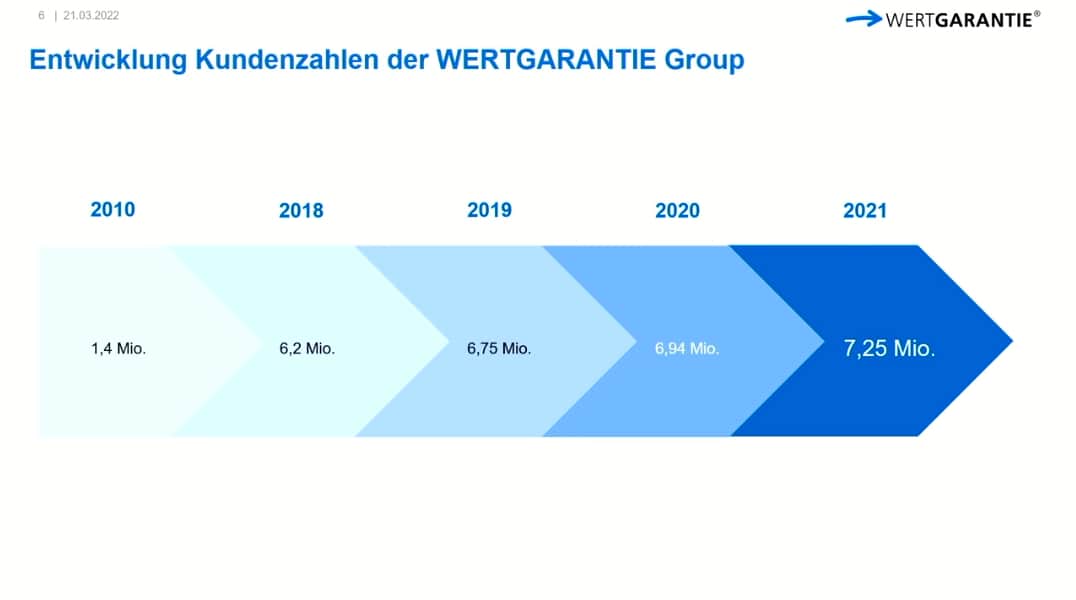 Das Jahr zwei in der Pandemie war für die Wertgarantie Group erneut ein wirtschaftlich erfolgreiches: Obwohl die gesteckten Ziele im Neugeschäft in einigen Segmenten nicht erreicht werden konnten, gelang es der Wertgarantie Group, das Geschäftsjahr mit insgesamt 1,7 Mio. Neuverträgen abzuschließen und den Bestand auf über 7,25 Mio. Kunden (2020: 6,94 Mio. Kunden) auszubauen.