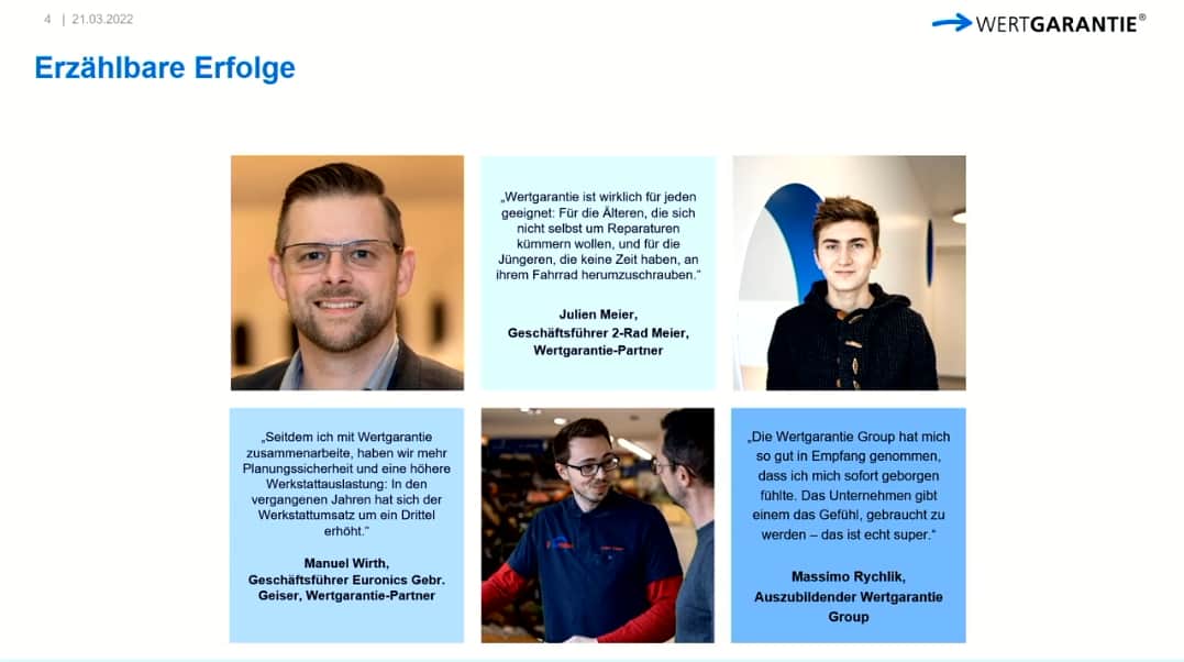 Unerlässlich für den Erfolg der Produkte und die Akzeptanz bei den Kunden ist zudem eine professionelle Schulung der Partner. Wertgarantie setzt auf ein komplett hybrides Konzept. Das bedeutet, die Online-Trainings unterstützen die Arbeit vor Ort. Wie und wo die Mitarbeiter der Fachhandelspartner geschult werden, entscheiden die Partner gemeinsam in Gesprächen mit Wertgarantie.