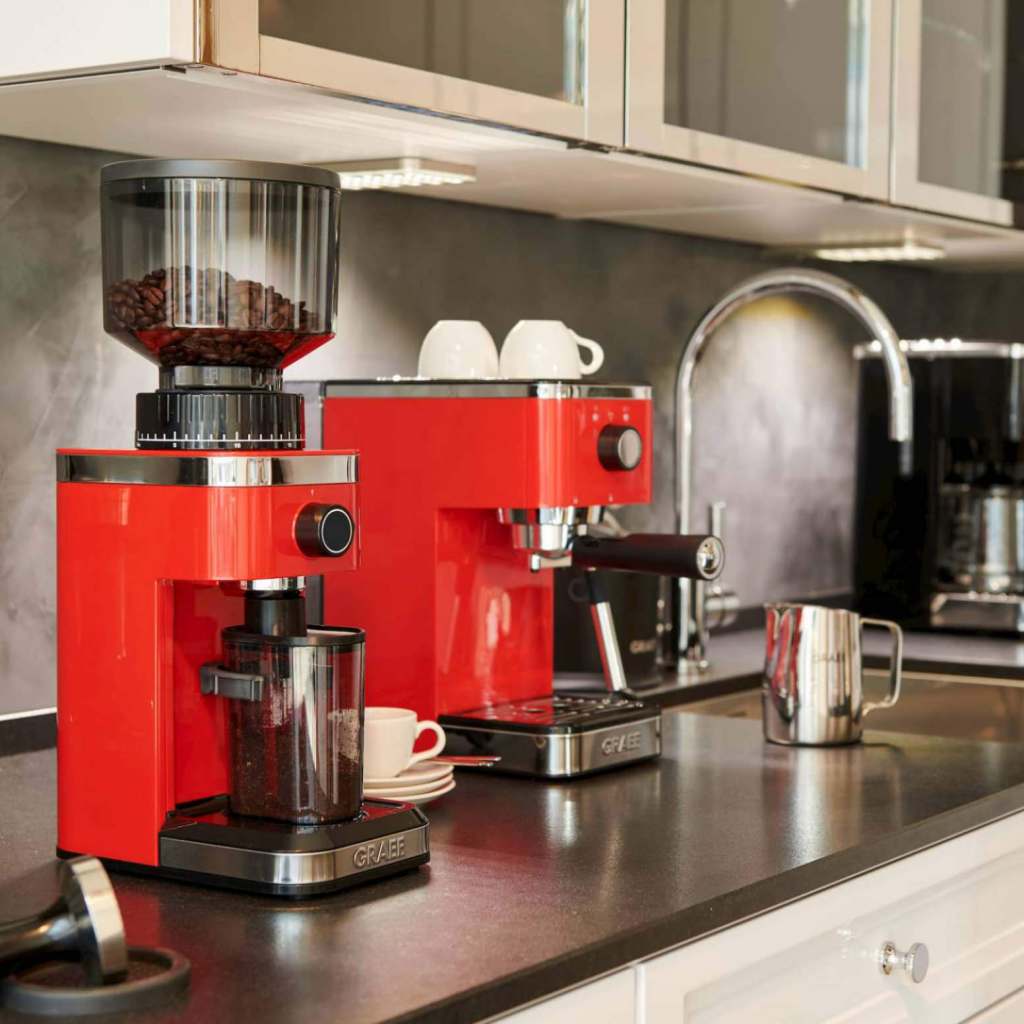 Die Kaffeemühle CM 500, die Graef zu seinem 100. Geburtstag herausgebracht hat, ist nicht nur optisch ein „Hingucker“. Sie eignet sich auch prima dafür, das Kaffeearoma optimal zur Geltung zu bringen. Die Mühle verfügt über ein aromaschonendes Kegelmahlwerk, das sich auf die ideale Körnung für jede Kaffeespezialität einstellen lässt. Ihr Kegelmahlwerk aus Edelstahl arbeitet mit einer niedrigeren Drehzahl als Scheiben- oder Schlagmahlwerke. So erhitzt es weniger, schont damit die Kaffeearomen. Zudem lässt es sich auf 140 verschiedene Mahlgrade einstellen.