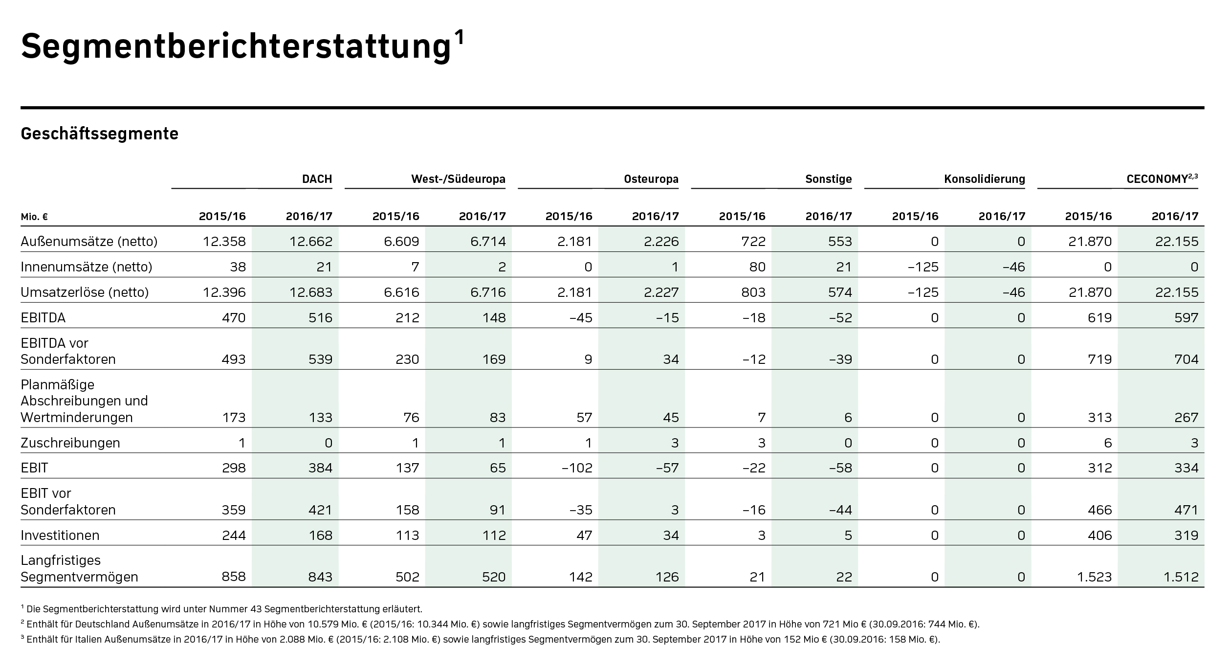 Im Geschäftsjahr 2016/17 steigerte Ceconomy ihren Gesamtumsatz um 1,3 % auf 22,2 Mrd. Euro (Vorjahr: 21,9 Mrd. Euro). Flächenbereinigt ergab sich sogar ein Anstieg um 1,9 %. Besonders stark gewachsen ist Ceconomy in Deutschland, Spanien und der Türkei. Die Onlineumsätze des Unternehmens stiegen im Jahresvergleich um 23 % (gar plus 40 % ohne Pure Player; insbesondere redcoon). Damit entfielen im abgelaufenen Geschäftsjahr bereits 10,9 % des Umsatzes auf Online/Mobile. Für das Geschäftsjahr 2017/18 erwartet Ceconomy ein leichtes Wachstum des Gesamtumsatzes im Vergleich zum Vorjahr.