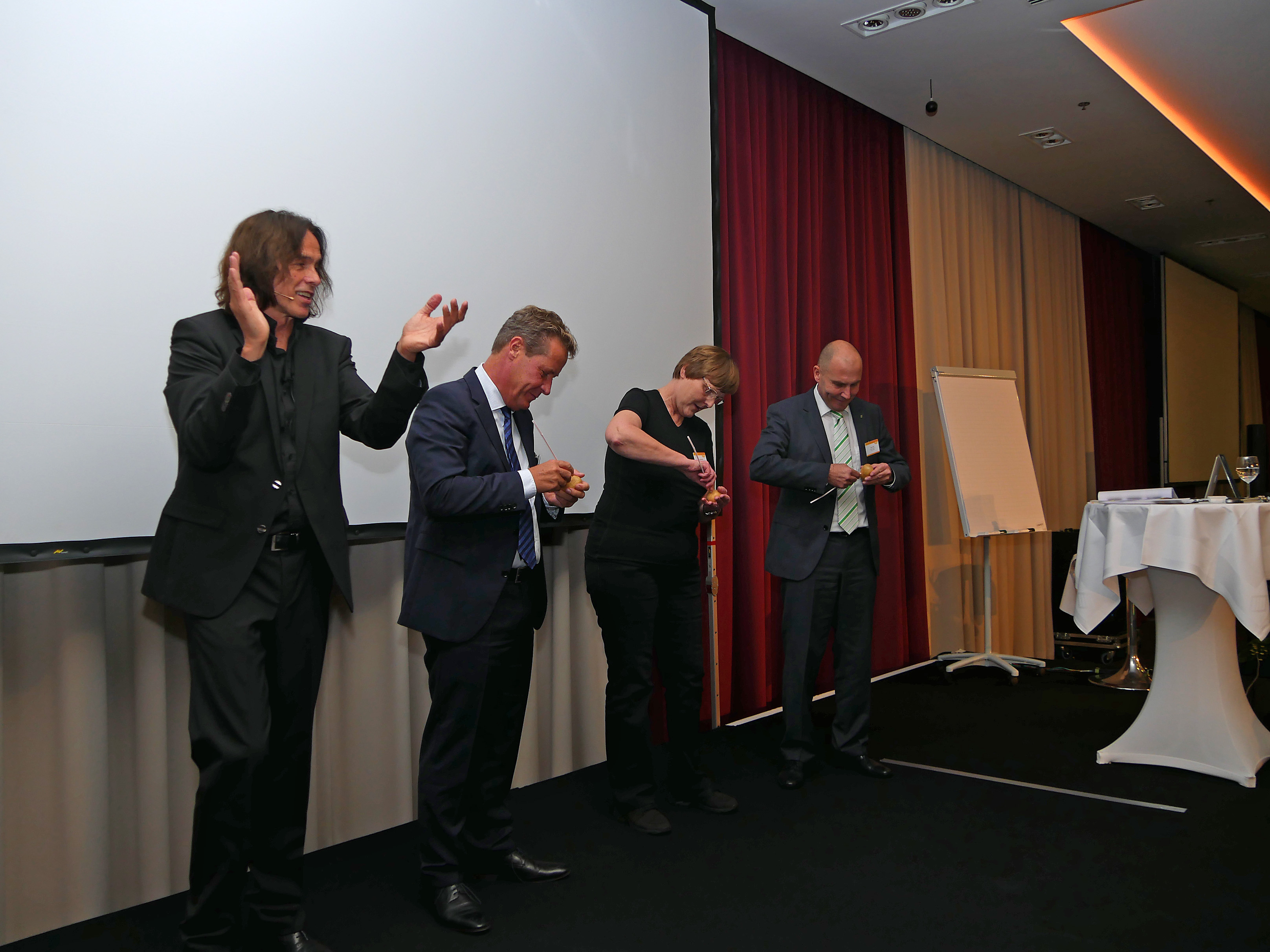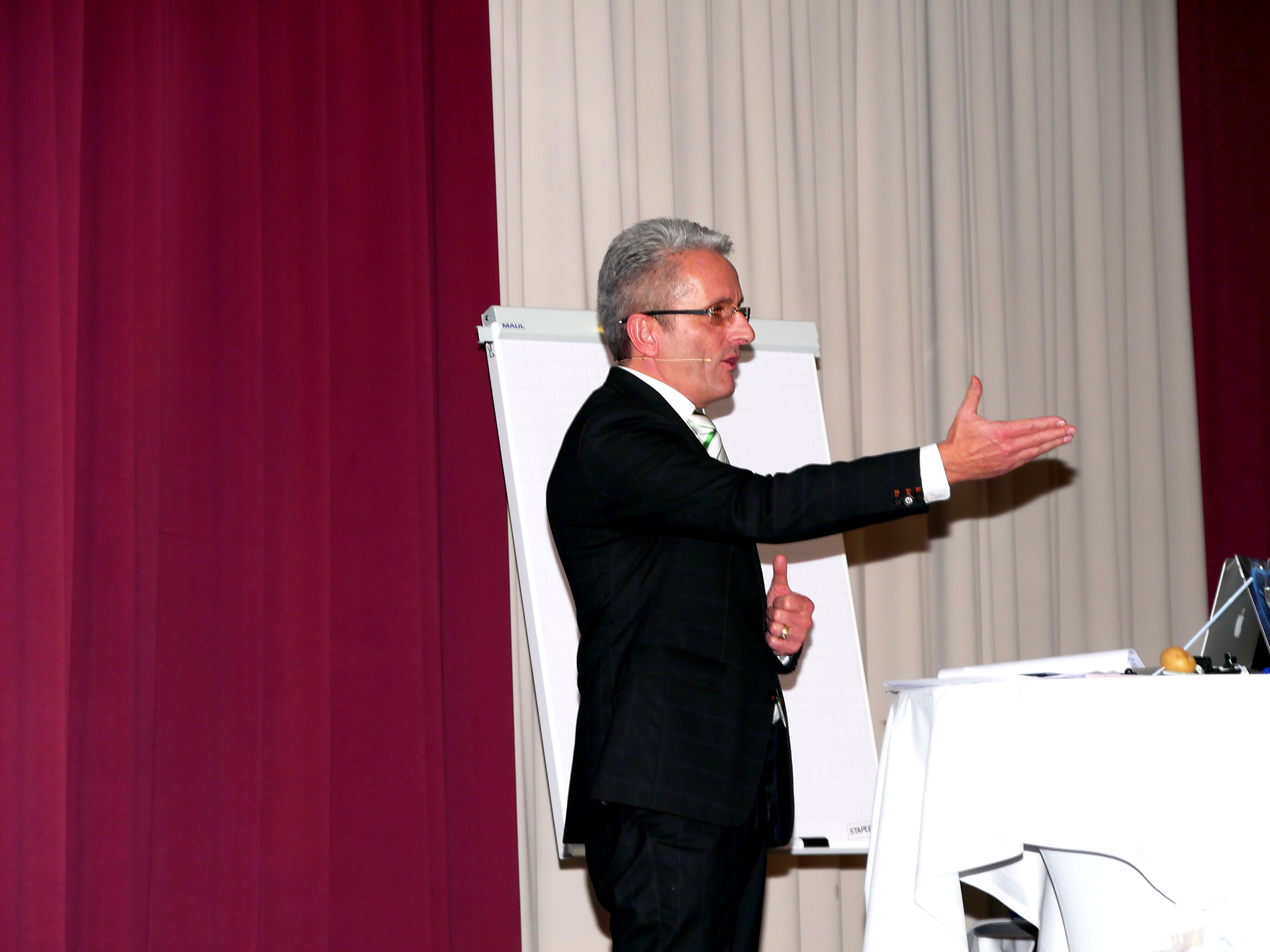 Mit dem Experiment wollte der Hirnforscher den WIR-Mitgliedern plastisch vermitteln: „Es bedarf nur eines winzigen neuen Gedankens, um eine entscheidende Veränderung herbeizuführen, um im Wettkampf – sprich im Markt – die Nase vorn zu haben.“ So leicht sich alles anhört, so schwer ist jedoch die Umsetzung. Rempes Trost an das Auditorium: „Das bisschen ist extrem aufwendig. Eine kleine Gewohnheitsänderung ist oftmals aufwendiger, als von allen Vieren in einen aufrechten Gang zu kommen.“