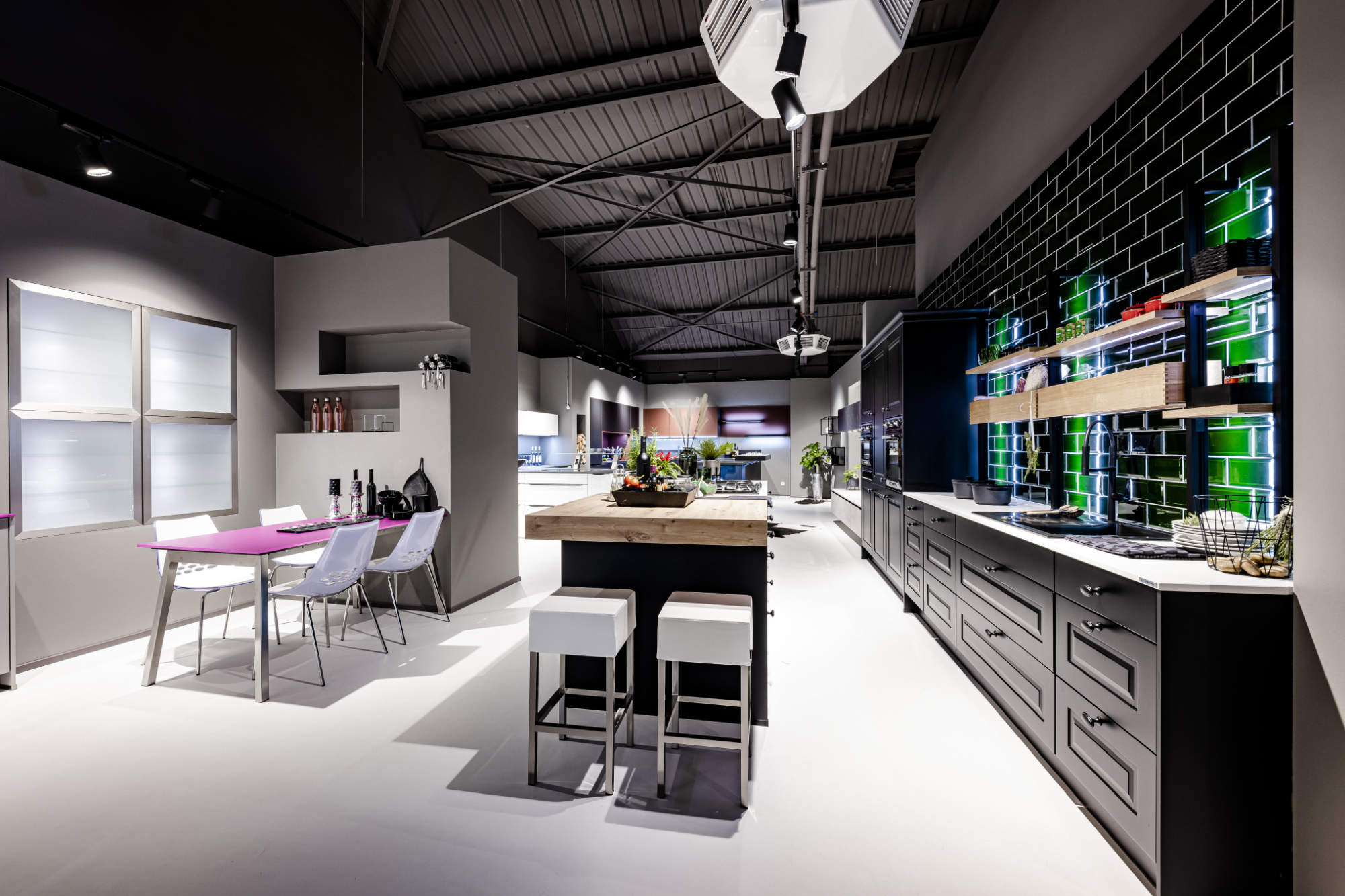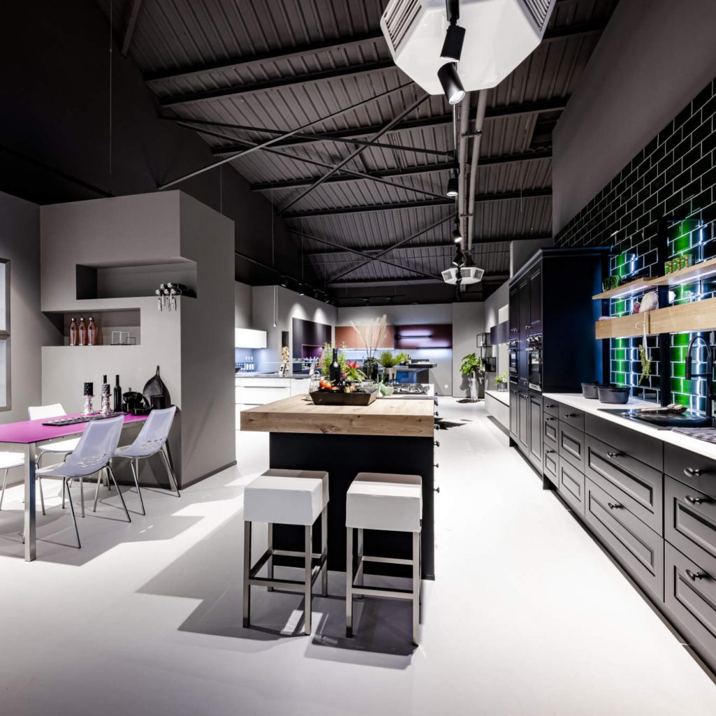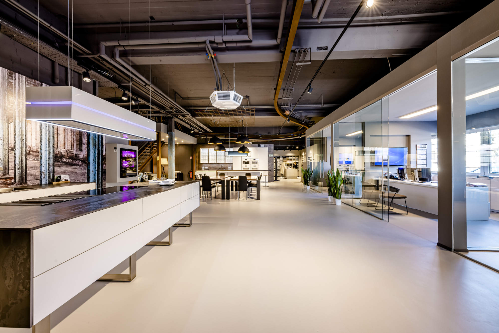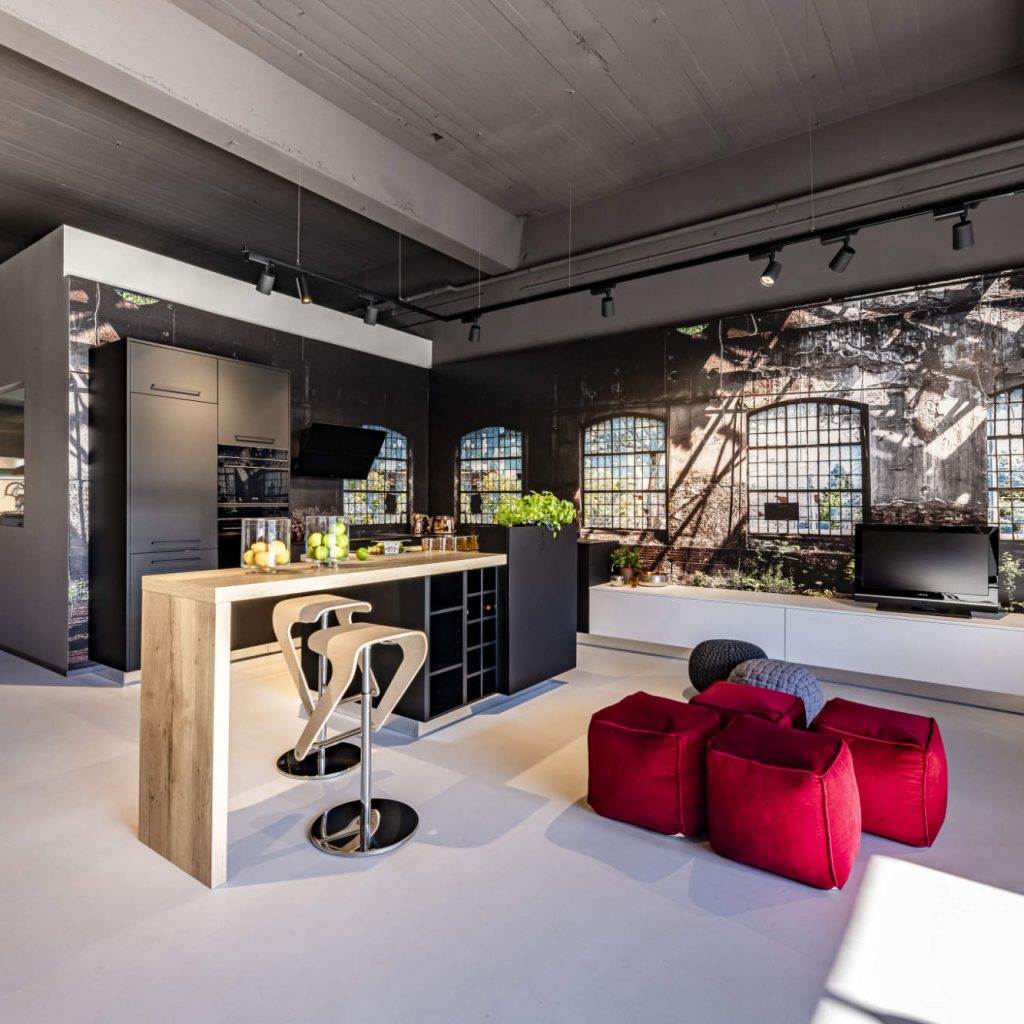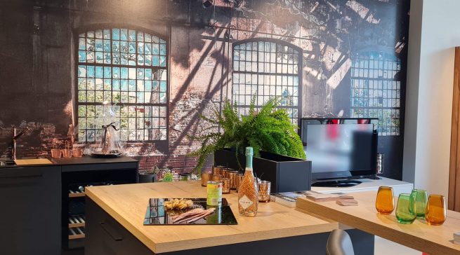 In der Küchenausstellung von küchenplus haben die Architekten und Planer gezielt auf einen Materialmix aus Altem und Neuem gesetzt. So wurden alte Eisensäulen und eine „Laufkatze“, ein in die Jahre gekommenes Förderband an der 4,50 Meter hohen Decke, aufwendig instand und in Szene gesetzt. Neben hochwertig ausgestatteten Küchen (u.a. Nolte, Nobilia, Sachsenküchen) mit stylischen Einbaugeräten (von AEG über Liebherr und Miele bis Samsung und Siemens) fällt der Blick bei unserem Rundgang auch auf ein komplett eingerichtetes Apartment mit offener Küche, Wohnbereich, Bad, Hauswirtschaftsraum und Garderobe. Hier wird eindrucksvoll Planungs- und Lösungskompetenz präsentiert, die weit über die klassische Einbauküche hinausgeht.