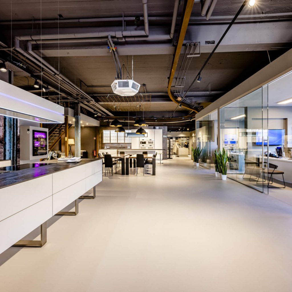 Auf der linken Seite des Hofes steht die erst kürzlich eröffnete, auf beinahe 500 Quadratmetern neu gestaltete küchenplus Küchenausstellung mit lauter Wohlfühlräumen und ganzheitlichen Wohnwelten, rechterhand hat electroplus seine Heimat. Hier wird in den kommenden Monaten kaum ein Stein auf dem anderen bleiben: Geplant sind u.a. neue Shops von Miele und Siemens wie eine offene Werkstatt für die Kaffeevollautomaten von Jura.