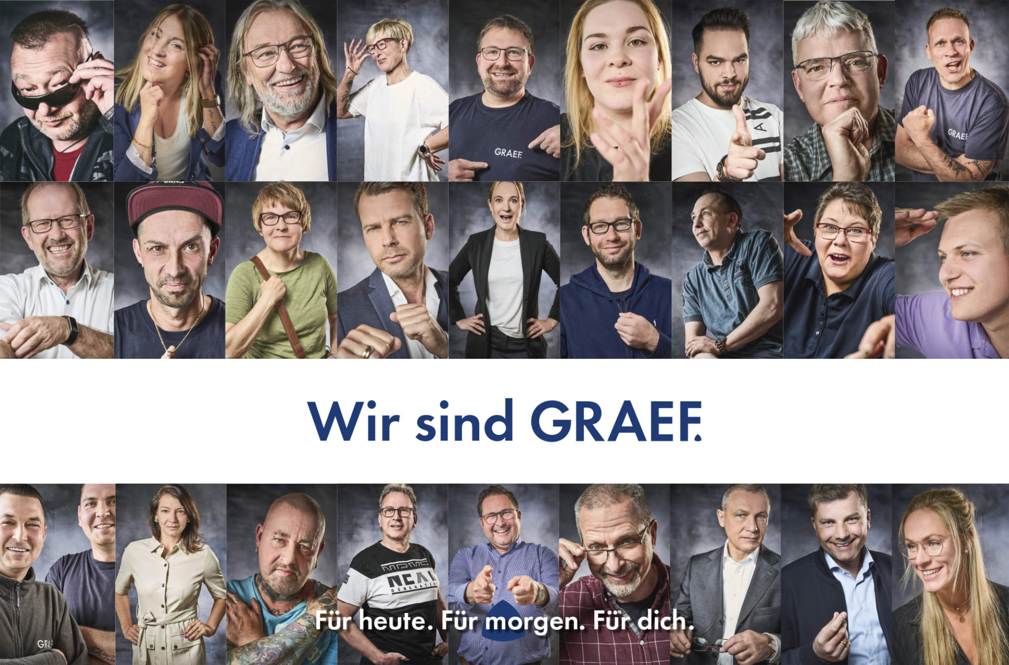 Wer hinter der Marke Graef und der neuen Unternehmensvision steckt, zeigen der Film und die Porträtfotos von 29 Mitarbeiterinnen und Mitarbeitern sowie der Geschäftsleitung, die als großformatige Poster, Roll-ups, Fahnen und sogar in Form eines großen Fassadenbanners die Firmensitze in Arnsberg schmücken.