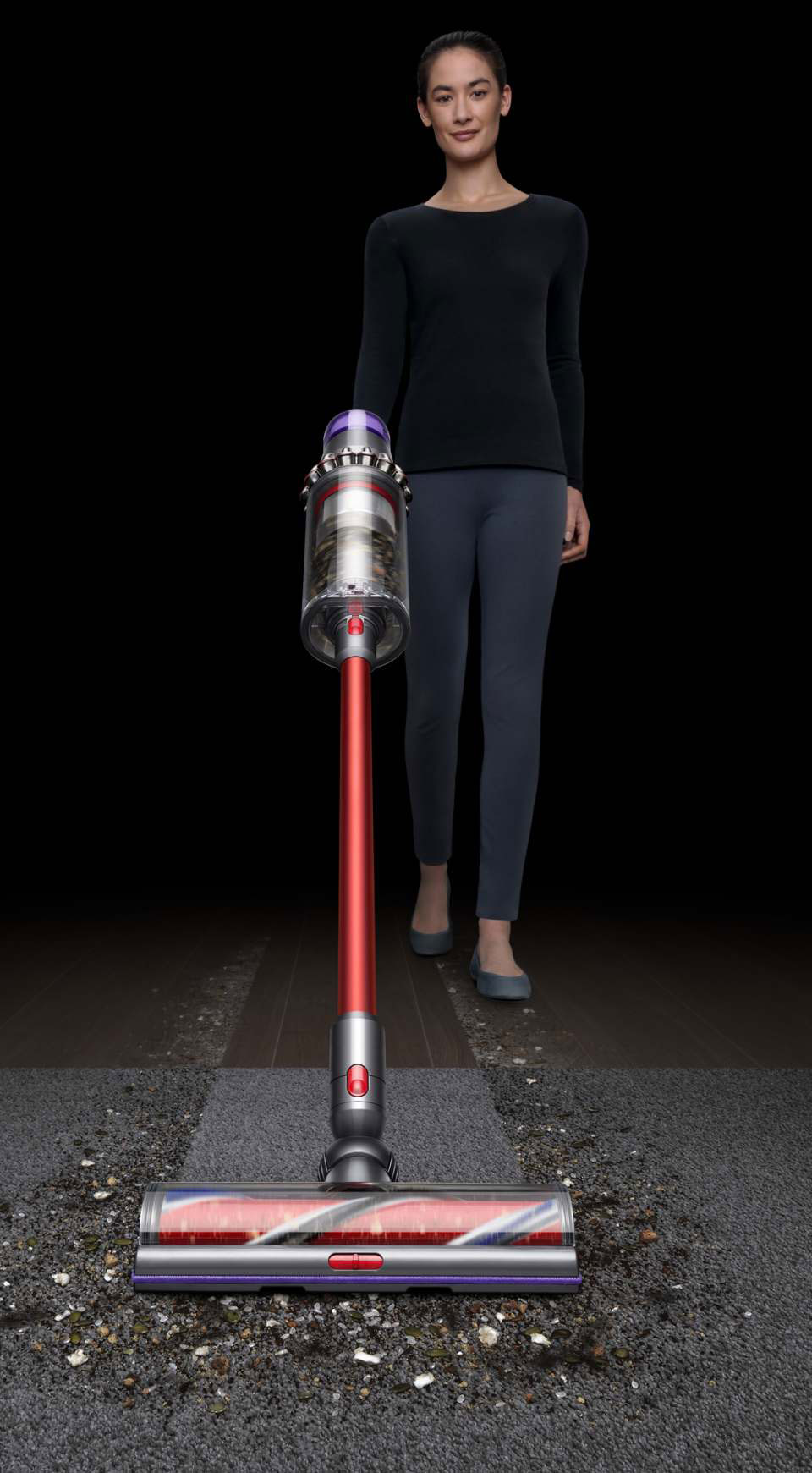 Der Dyson Staubsauger V11 Outsize ist ein extra großer Staubsauger, um Verschmutzungen in großen Häusern zu beseitigen. Aufbauend auf dem Dyson V11 Absolute Extra wurde der Staubsauger mit einem um 150% größeren Staubbehälter und einer um 25% größeren Bodendüse ausgestattet. Zudem enthält er einen austauschbaren Nickel-Cobalt-Aluminium-Akku, wodurch im Eco-Modus bis zu 60 Minuten lange Reinigungsvorgänge ohne Saugkraftverlust möglich werden. Das Gerät bietet Dysons höchste Saugkraft im Boost-Modus dank des leistungsstarken Dyson Hyperdymium Motors und 18 Dyson Zyklonen, die Zentrifugalkräfte von mehr als 79.000 G erzeugen, um mikroskopisch kleine Partikel wie Staub, Pollen oder Bakterien in den Staubbehälter zu befördern.