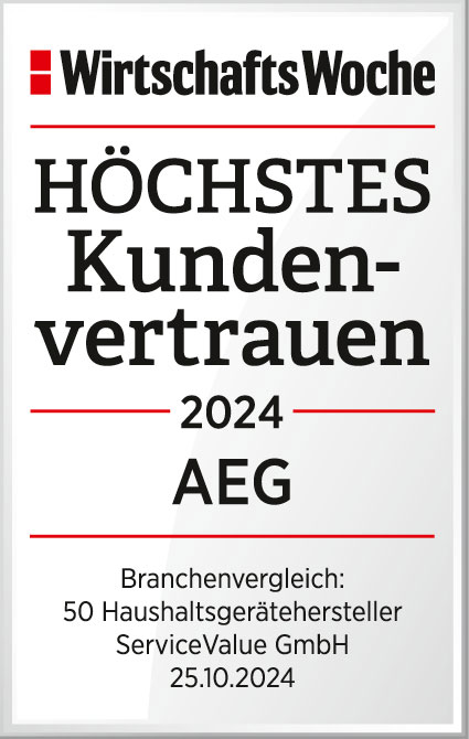 Die Premiummarke AEG wurde 2024 erneut mit dem Siegel „Höchstes Kundenvertrauen“ ausgezeichnet. Bereits zum elften Mal in Folge erhält die Marke diese Anerkennung, die auf einer der größten Verbraucherumfragen Deutschlands basiert. Mit einem Kundenvertrauensindex (KVI) von 87,9% belegte AEG Platz 1 unter den Hausgeräteherstellern und gehört zudem zu den zehn vertrauenswürdigsten Unternehmen im Land.