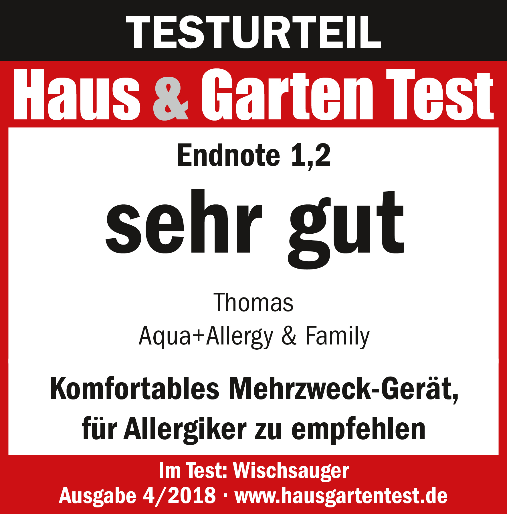 „Mit ihm kann man Hartböden und Polster trocken oder nass reinigen, Flüssigkeiten aufsaugen, und er ist besonders geeignet für Hausstaub- und andere Allergiker“, lautet das Fazit der Testjury des Magazins „Haus & Garten Test“. Und so sichert sich der beutellose Staubsauger „Thomas Aqua+ Allergy & Family“ im aktuellen Vergleichstest des Magazins (Ausgabe 4/2018) mit der Gesamtnote 1,2 („sehr gut“) den Testsieg vor dem Modell „AquaTrio Pro FC7080“ von Philips.