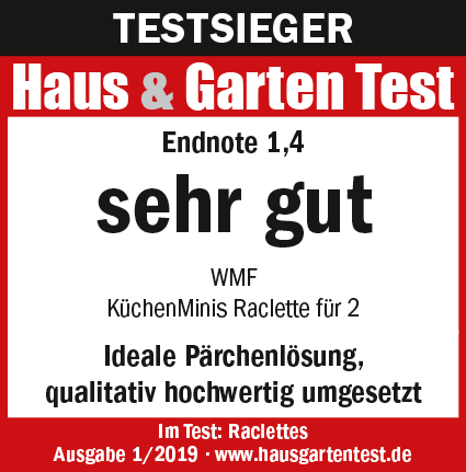 Das „KÜCHENminis Raclette für 2“ von WMF hat einen Vergleichstest des Magazins Haus & Garten Test (Ausgabe 01/2019) unter sieben Raclettes bis 100 Euro gewonnen. Das Gerät wurde als „sehr gut“ und mit einer Endnote von 1,4 ausgezeichnet.