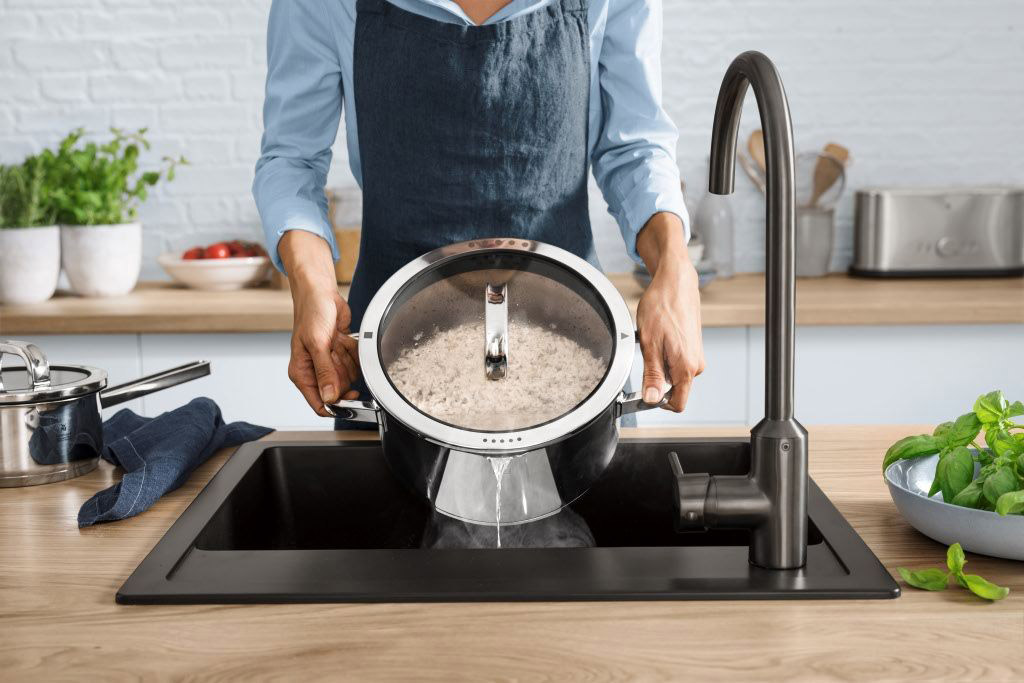Schwarz liegt im Trend, auch bei Lebensmitteln. Ob Reis, Pasta oder Belugalinsen – die Trendfarbe erobert gerade Töpfe und Pfannen von innen, wie von außen. Mit der Jubiläums-Edition präsentiert WMF die „Function 4“-Serie nun auch in edlem schwarz. Hauptmerkmal der Kollektion ist ein hochwertiger Glasdeckel mit innovativen Features: Bei geschlossener Deckelposition kann wasserarm und damit mineralstofferhaltend gegart werden. Zum kontrollierten Abgießen des Kochwassers kann je nach Bedarf zwischen der offenen Position, der mittleren Lochung oder der kleinen Lochung gewählt werden. So läuft wirklich nur die Flüssigkeit ab. Egal, ob schwarze Bohnen, Nudeln, Linsen oder Reis zubereitet werden: das Sieb kann im Schrank bleiben.