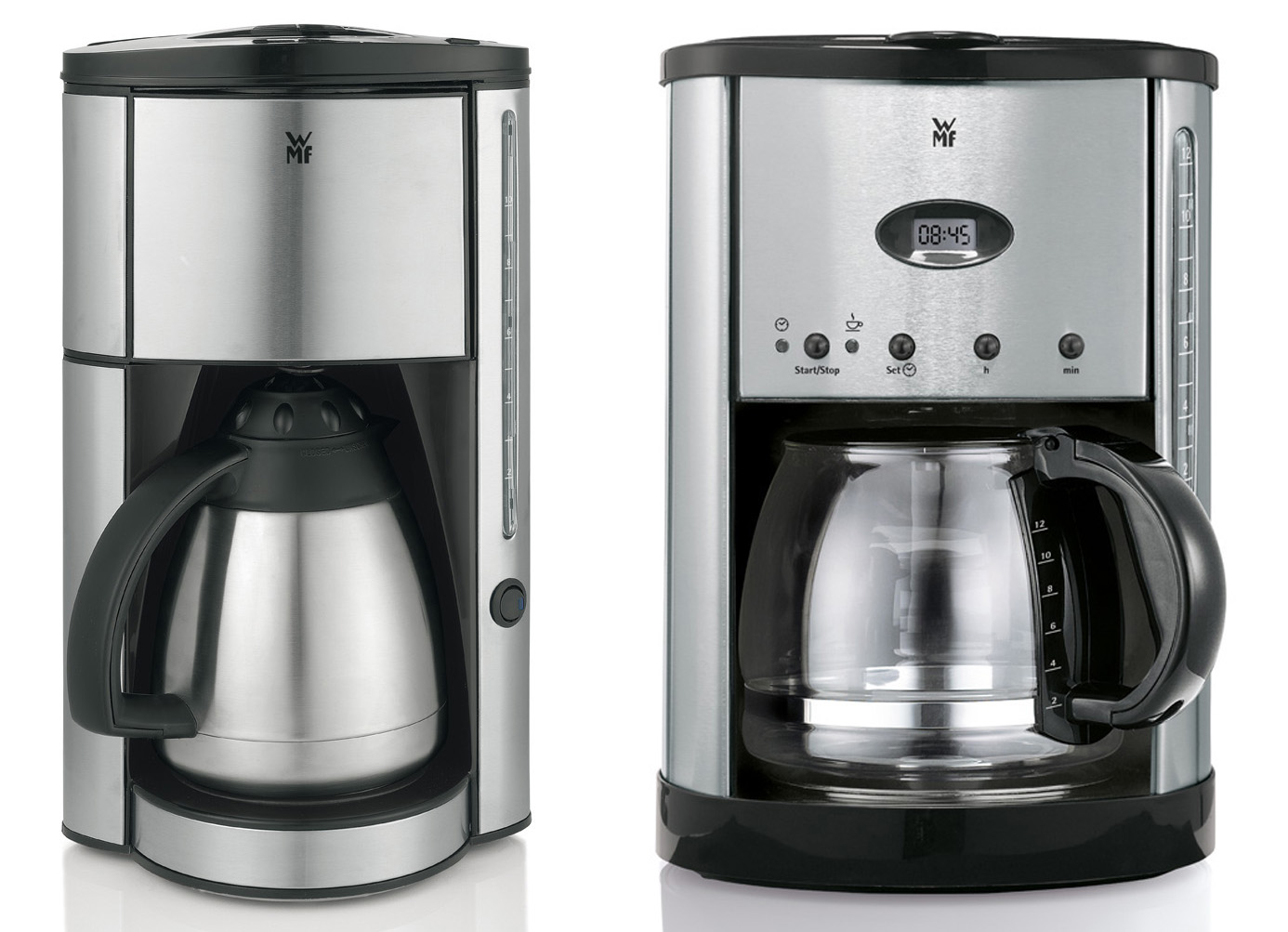 Die WMF Genio Kaffeemaschine ist als Thermo- oder Glasgerät erhältlich. Beide Geräte sind Bestandteil des insgesamt 7-teiligen Küchensortiments. Bei dem Sortiment ist der seidenmatt glänzende Edelstahl mit schwarzen Konturen abgesetzt. So ermöglichen die gestalterisch auf einander abgestimmten Produkte vielfältige und bedürfnisgerechte Einsatzmöglichkeiten in der Küche.