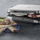 Die antihaftbeschichtete Grillplatte aus Aluminiumguss bietet eine Grillfläche von 40 x 29 cm. Das wärmeisolierte Gehäuse besteht aus hochwertigem, mattiertem Cromargan.