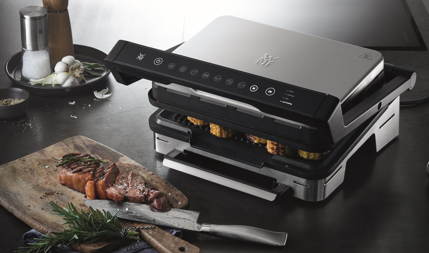 Optisch bietet der Grill klassische WMF-Designsprache mit im Griff integrierter Bedienoberfläche. Sein hochwertiges Gehäuse besteht aus Cromargan, das LED-Touch-Display ist aus WMF Qualitätsglas gefertigt und intuitiv steuerbar.