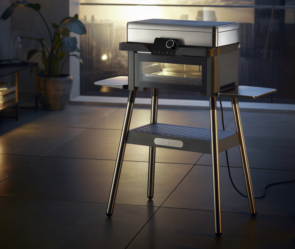 Gestaltet ist das Gerät im WMF-Look aus Cromargan. Die Benutzeroberfläche verfügt über ein Touch-Display und Drehknöpfe für eine intuitive Steuerung. Zudem verfügt sie über einen Steckeinsatz für ein kabelgebundenes Grillthermometer. Für eine sichere Outdoor-Benutzung ist der Grill IPx4 zertifiziert.
