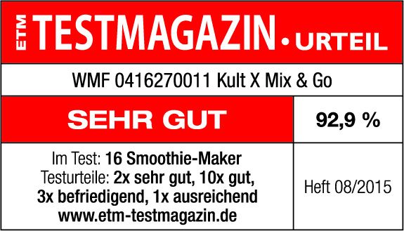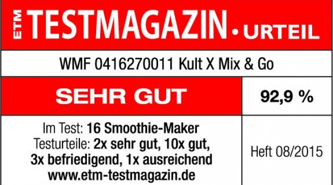 Selbstgemachte grüne Smoothies sind das Trendgetränk in diesem Sommer. In einem Vergleichtest von 16 Geräten des ETM-Testmagazins (Ausgabe 8.2015) überzeugte der Smoothie Maker Kult x Mix & Go von WMF mit einem sehr guten Ergebnis. Die Stärken des kultigen Smoothie Makers: sehr gute Mixergebnisse, Materialqualität, Crushed Ice und spülmaschinengeeignet. In die Bewertung sind die Ausstattung, Handhabung, Leistung und Sicherheit eingegangen. Dazu Brand Manager Christian Schneider: „Das Ergebnis sehr gut stellt unter Beweis, dass auch kleine Geräte mit großer Leistung glänzen können.“