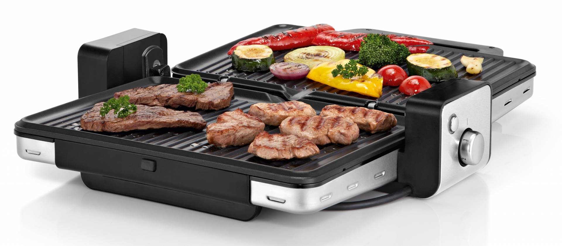 Neu entwickelt wurde die Vario-Flex Grillplatte, das heißt die obere Grillplatte ist variabel-flexibel aufgehängt. Die Platten lassen sich für dickeres Grillgut weit auseinander ziehen und der Deckel kann zudem dreidimensional bewegt und angepasst werden. Auch bei gleichzeitigem Grillen von Grillgut mit unterschiedlichen Höhen liegt die Grillplatte optimal auf dem Fleisch, Fisch oder Gemüse, so dass sich die Hitze gleichmäßig verteilt und die Zutaten perfekt gegrillt werden.