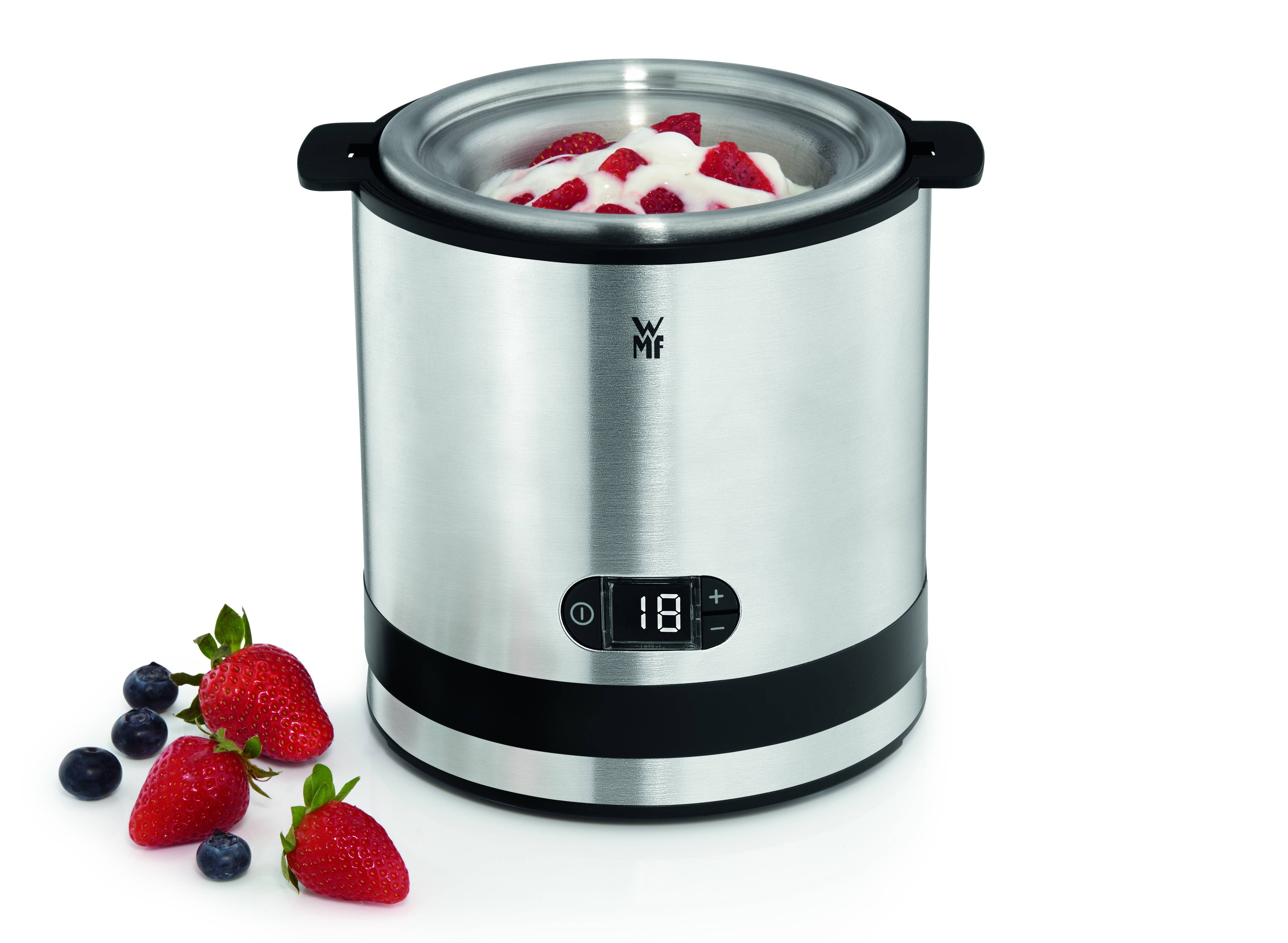 Die WMF KÜCHENminis® Eismaschine 3in1 – eine Abkühlung gefällig? Wie wäre es mit einem frisch zubereiteten Pistazien-Eis oder einem köstlichen Mango-Sorbet? Durch das Verrühren verschiedener Zutaten bei gleichzeitigem Untermischen von Luft und dem Herunterkühlen der Masse können mit der kompakten Eismaschine in nur wenigen Minuten feinste Eis-Kreationen gezaubert werden. Je nach Zutaten und Laufzeit entsteht auf diesem Weg Frozen Yoghurt, Sorbet oder Eiscreme. Frisch gerührt ist die Eismasse sehr luftig und fluffig, so dass man auf (künstliche) Stabilisatoren problemlos verzichten kann. Die WMF KÜCHENminis® Eismaschine 3in1 aus Cromargan® bedient sich der passiven Kühlung durch einen Kühlakku, der sich im Gefrierbehälter befindet. Dadurch ist das Gerät viel kleiner und es ist leichter, die Einzel- und Zubehörteile zu entnehmen. Entsprechend einfach erfolgt die Reinigung. Der Gefrierbehälter wird im Kühlfach oder in der Tiefkühltruhe vor der Benutzung auf -18 °C herunter gekühlt und kann dann sofort für die Zubereitung von Gefrorenem genutzt werden. In dem vorgekühlte Gefrierbehälter mit einem Fassungsvermögen von 300 ml setzt man den rotierenden Rührer und füllt die gewünschten Zutaten ein. Die WMF KÜCHENminis® Eismaschine 3in1 läuft mit nur 12 Watt und produziert dreierlei Gefrorenes per Zeitsteuerung: Frozen Yoghurt, Sorbet und Eiscreme. An einem LC-Display kann man per Countdown-Funktion die Restlaufzeit ablesen. Die fertig gerührte und gekühlte Eismasse stellen Sie bis zum Verzehr ganz einfach im Gefrierbehälter kalt – ein passender Deckel und ein WMF Eislöffel zur anschließenden Portionierung werden als hilfreiches Extra mitgeliefert.