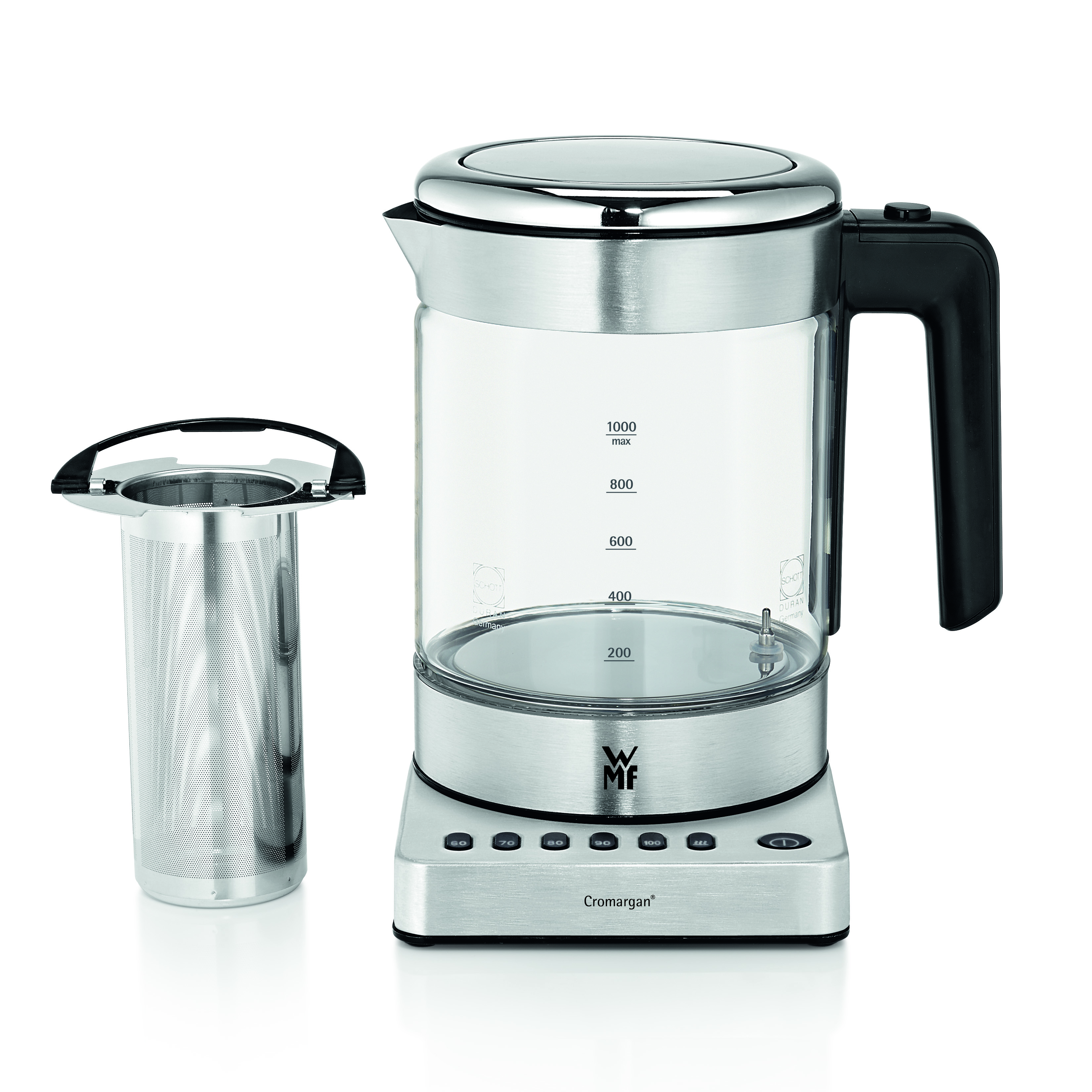Der WMF KÜCHENminis® Glas-Wasserkocher Vario aus Cromargan® kann mehr. Sein Krug ist aus hochwertigem SCHOTT Duran Glas, die erste Wahl in Sachen Beständigkeit bei Hitze und Temperaturwechseln. Hinzu kommt eine schicke Innenraumbeleuchtung. Er fasst 1 Liter und – ganz vario – kann man zwischen fünf Temperaturstufen wählen, von 60 °C bis 100 °C. Darüber hinaus steht eine Abkochfunktion zur Verfügung, ideal für Babynahrung oder wann immer sonst nahezu keim- und kalkfreies Wasser benötigt wird. Mit seinen 1.900 Watt Leistung bringt der kompakte WMF KÜCHENminis® Glas-Wasserkocher Vario das Wasser schnell auf die gewünschte Temperatur, benötigt aber nur wenig Stellfläche in der Küche. Die Zusatzfunktion als Teebereiter schafft zusätzlichen Platz, weil keine extra Teekanne mehr benötigt wird. Teetrinker werden ihre besondere Freude haben: Im Lieferumfang sind ein herausnehmbares Aroma-Mikro-Sieb aus Cromargan® und ein integrierter Teebeutelhalter enthalten. Am WMF KÜCHENminis® Glas-Wasserkocher Vario kann jede gewünschte Tee-Temperatur voreingestellt werden.