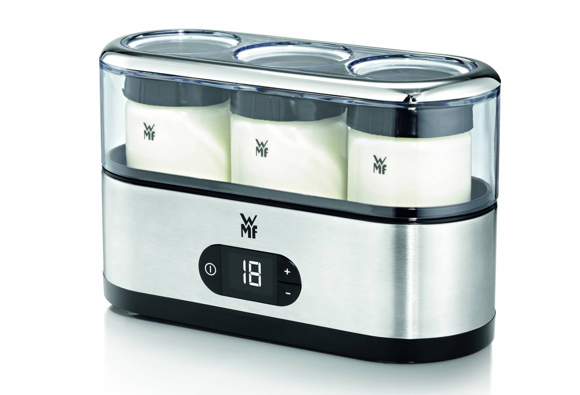 Der WMF KÜCHENminis® Joghurtbereiter ermöglicht es, Joghurt selbst zu machen. Es erfordert die richtige Bakterienkultur und eine stabile Temperatur über eine bestimmte Zeit. So wird aus Milch ein köstlich-frischer Joghurt. Durch die Zugabe von Schokosplittern, Kakao, gemahlenen Nüssen, Marmelade, frischen Früchten oder Obst kann man seinen Joghurt nach Lust und Laune variieren. Der platzsparende WMF KÜCHENminis® Joghurtbereiter aus Cromargan® sorgt über seine elektronisch gesteuerte Temperaturregelung für eine gleichbleibende Temperatur und schafft das perfekte Milieu für die Joghurtkulturen.