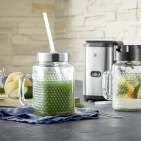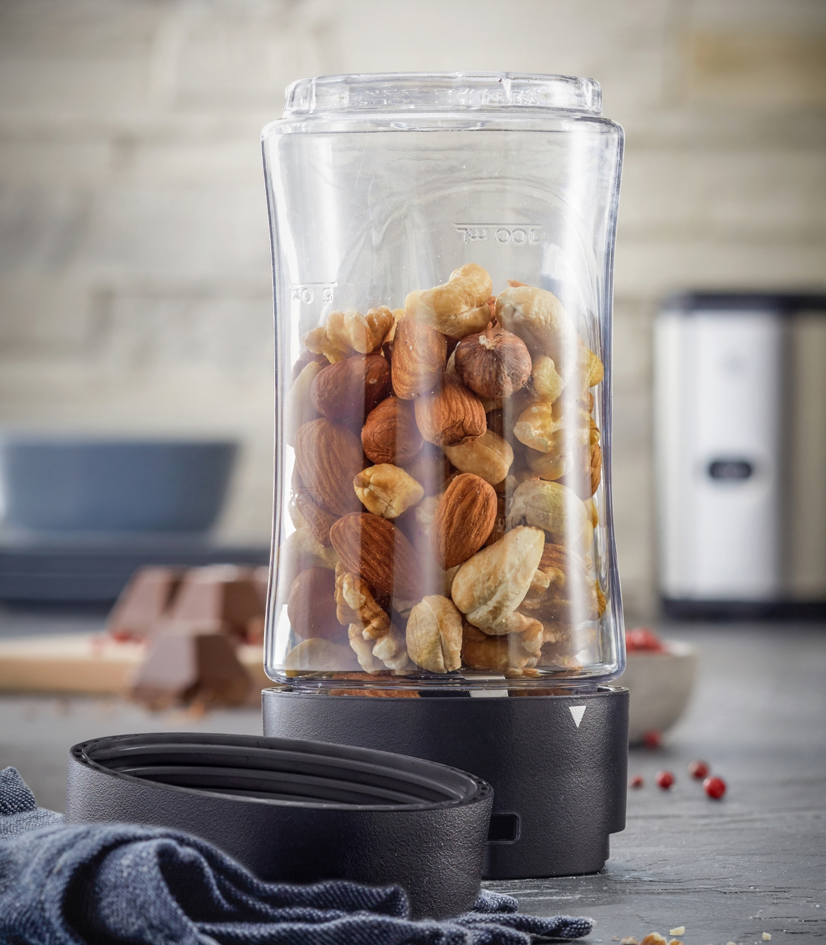 Wenn es um das Zerkleinern und Hacken von härteren oder trockenen Zutaten wie Nüssen, getrocknetem Obst oder Gemüse geht, dann bietet das drei-teilige Zubehör-Set den perfekten Mehrwert. Es besteht aus einem Tritan-Mixbehälter mit 0,3l Fassungsvermögen, einer zwei-flügeligen Messereinheit sowie einem Verschlussdeckel mit Silikonring zur Aufbewahrung und erweitert damit den praktischen Anwendungsbereich sowohl beim WMF Kult X Mix & Go, als auch beim WMF KÜCHENminis Smoohtie-to-go.