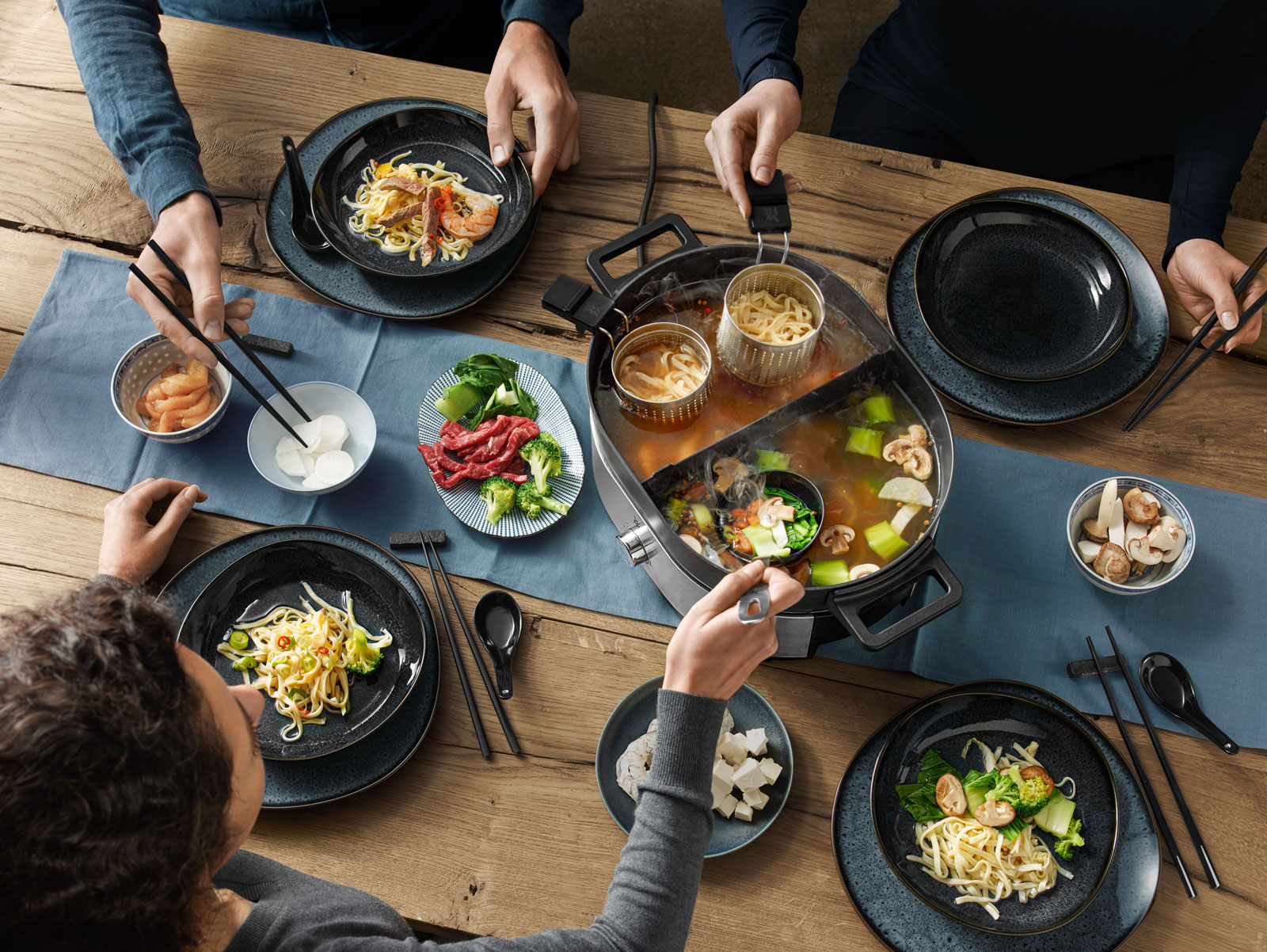 Mit dem eleganten Lono Hot Pot & Dampfgarer bringt die Marke WMF in nur einem einzigen Gerät kulinarische Trends aus der ganzen Welt zusammen. Die spannende Kombination aus Hot Pot und Dampfgarer eignet sich perfekt, um einzelne Zutaten und verschiedene Saucen oder Brühen gleichzeitig zuzubereiten – damit lassen sich auch die einfachsten Gerichte in exotische kulinarische Momente verwandeln!