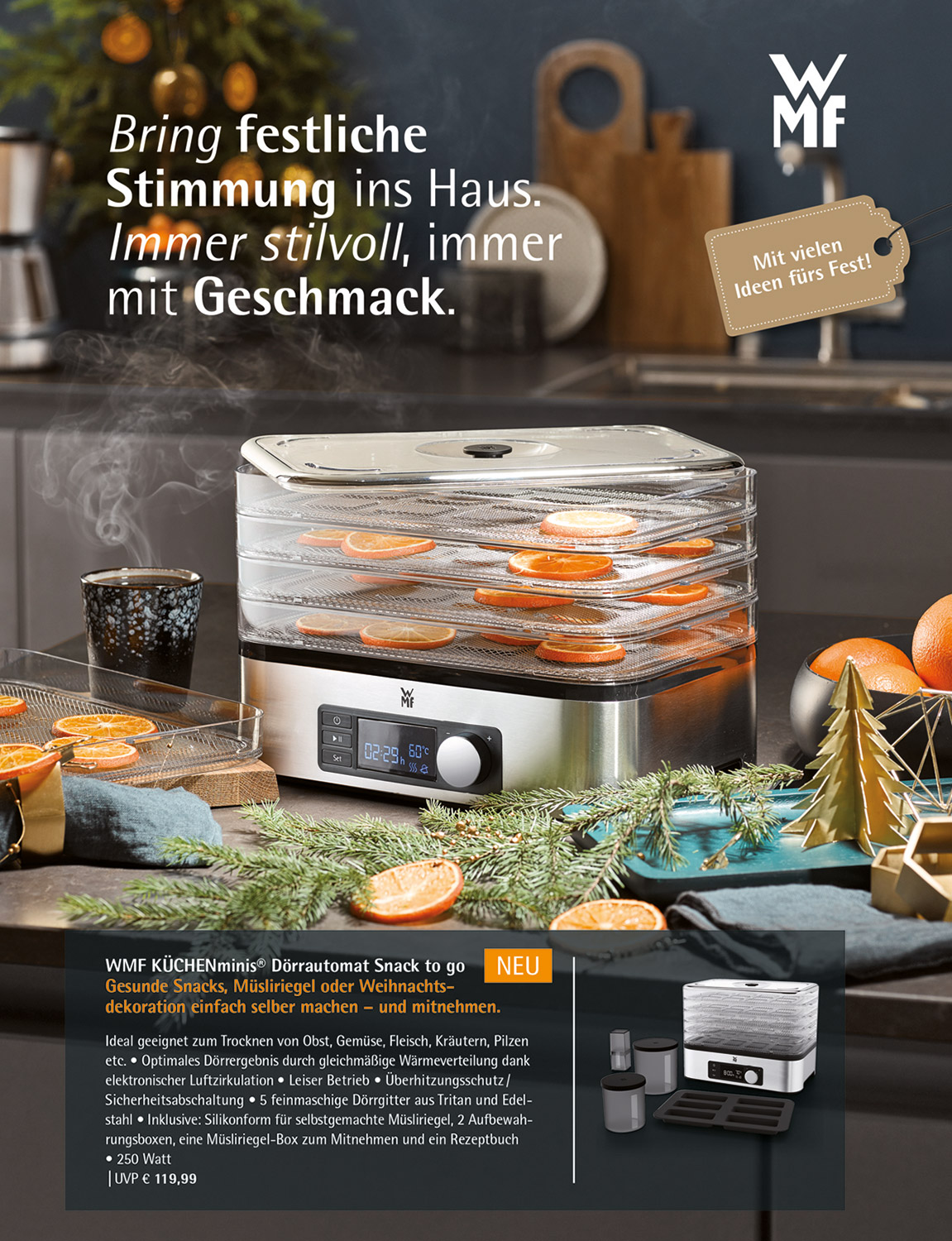 Mit zwei bundesweiten Beihefterkampagnen in der Publikumspresse startet die Elektrokleingerätesparte der WMF Group mit voller Kraft in den Herbst und das Weihnachtsgeschäft. So gibt es einen zwölfseitigen Beihefter zur aktiven Endverbraucherwerbung speziell mit Elektrokleingeräten sowie zwei Kleingeräte-Sonderseiten im WMF Weihnachts-Beihefter. Beide Aktionen stehen unter dem Motto „Bring festliche Stimmung ins Haus. Immer stilvoll, immer mit Geschmack.“