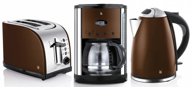 WMF Terra Filterkaffeemaschine, Wasserkocher, Toaster (WMF Terra Frühstücksset) sind ab Oktober 2011 zu den UVPs von 69,99 € für die Kaffeemaschine, zu 64,99 € für den Wasserkocher sowie zu 64,99 € für den Toaster erhältlich.